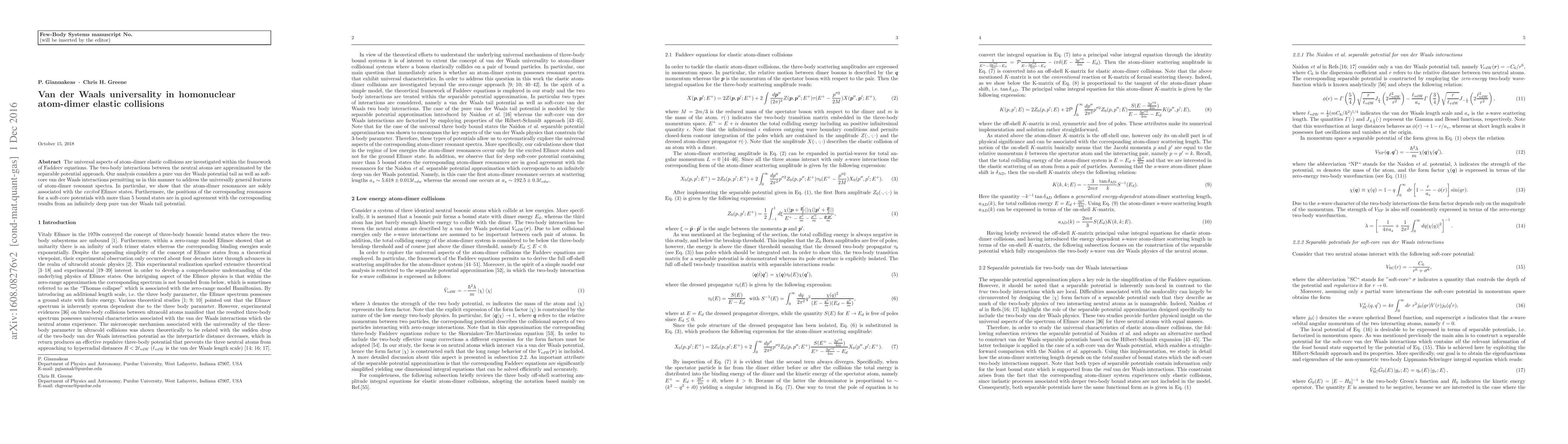 This research explores universal features of homonuclear atom-dimer elastic collisions using Faddeev equations and separable potentials. It demonstrates that atom-dimer resonances are linked to excited Efimov states, and shows agreement between soft-core van der Waals interactions and pure van der Waals potentials in predicting resonant positions.
