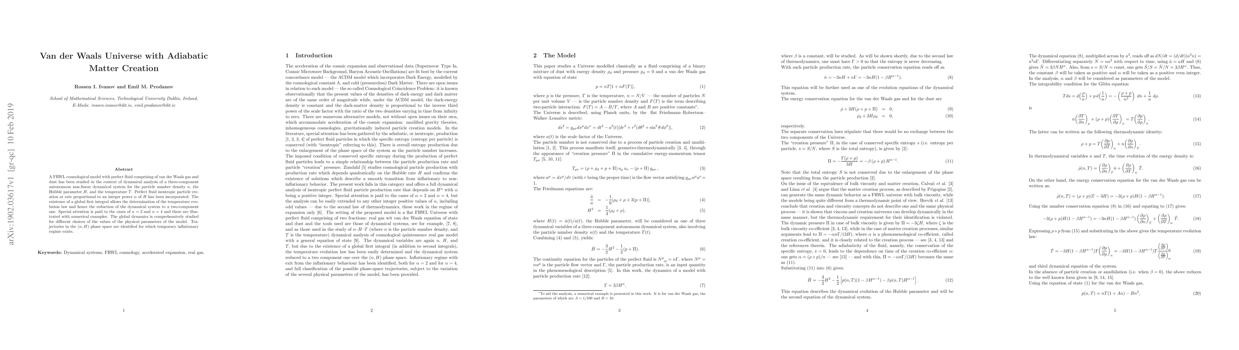 A FRWL cosmological model with perfect fluid comprising of van der Waals gas and dust has been studied in the context of dynamical analysis of a three-component autonomous non-linear dynamical system for the particle number density $n$, the Hubble parameter $H$, and the temperature $T$. Perfect fluid isentropic particle creation at rate proportional to an integer power $\alpha$ of $H$ has been incorporated. The existence of a global first integral allows the determination of the temperature evolution law and hence the reduction of the dynamical system to a two-component one. Special attention is paid to the cases of $\alpha = 2$ and $\alpha = 4$ and these are illustrated with numerical examples. The global dynamics is comprehensively studied for different choices of the values of the physical parameters of the model. Trajectories in the $(n, H)$ phase space are identified for which temporary inflationary regime exists.