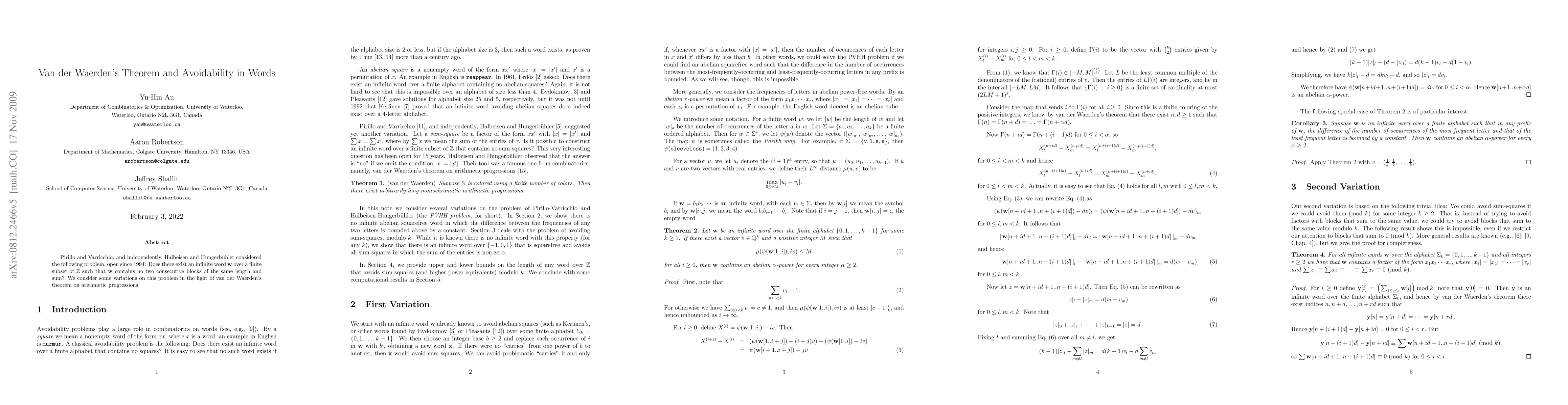 This paper explores variations of the open problem from 1994 regarding infinite words over finite subsets of integers that avoid consecutive blocks of the same length and sum. It applies insights from van der Waerden's theorem on arithmetic progressions to investigate the avoidability of such patterns.