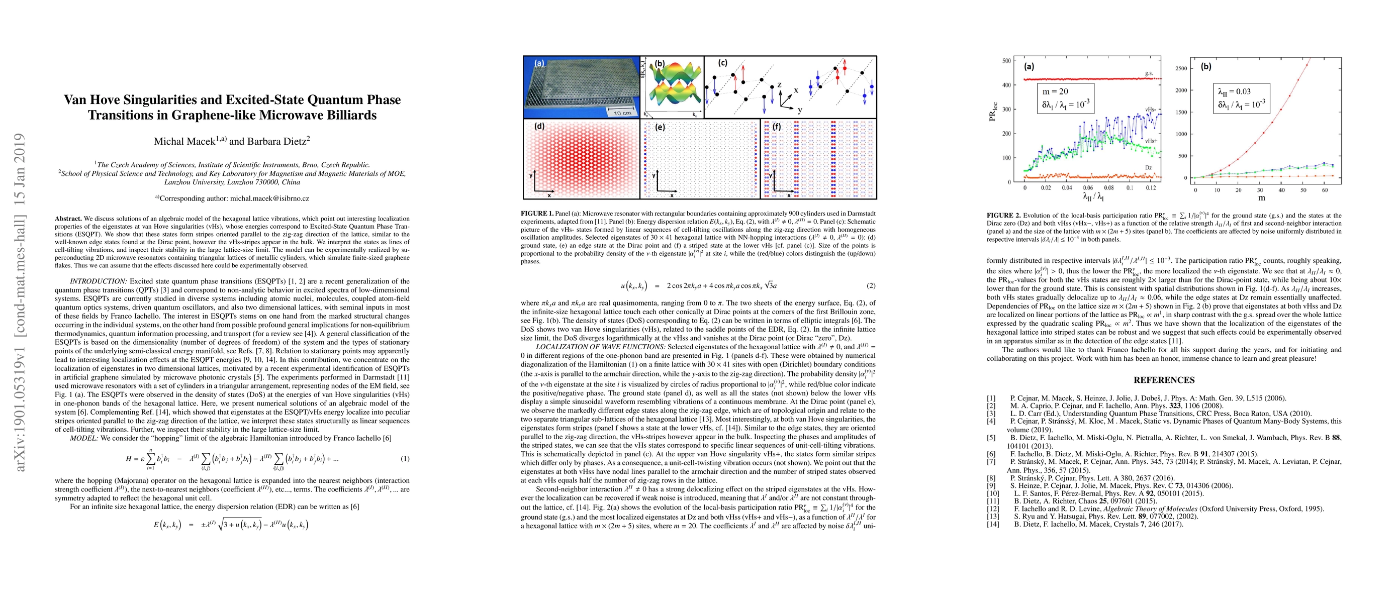We discuss solutions of an algebraic model of the hexagonal lattice vibrations, which point out interesting localization properties of the eigenstates at van Hove singularities (vHs), whose energies correspond to Excited-State Quantum Phase Transitions (ESQPT). We show that these states form stripes oriented parallel to the zig-zag direction of the lattice, similar to the well-known edge states found at the Dirac point, however the vHs-stripes appear in the bulk. We interpret the states as lines of cell-tilting vibrations, and inspect their stability in the large lattice-size limit. The model can be experimentally realized by superconducting 2D microwave resonators containing triangular lattices of metallic cylinders, which simulate finite-sized graphene flakes. Thus we can assume that the effects discussed here could be experimentally observed.