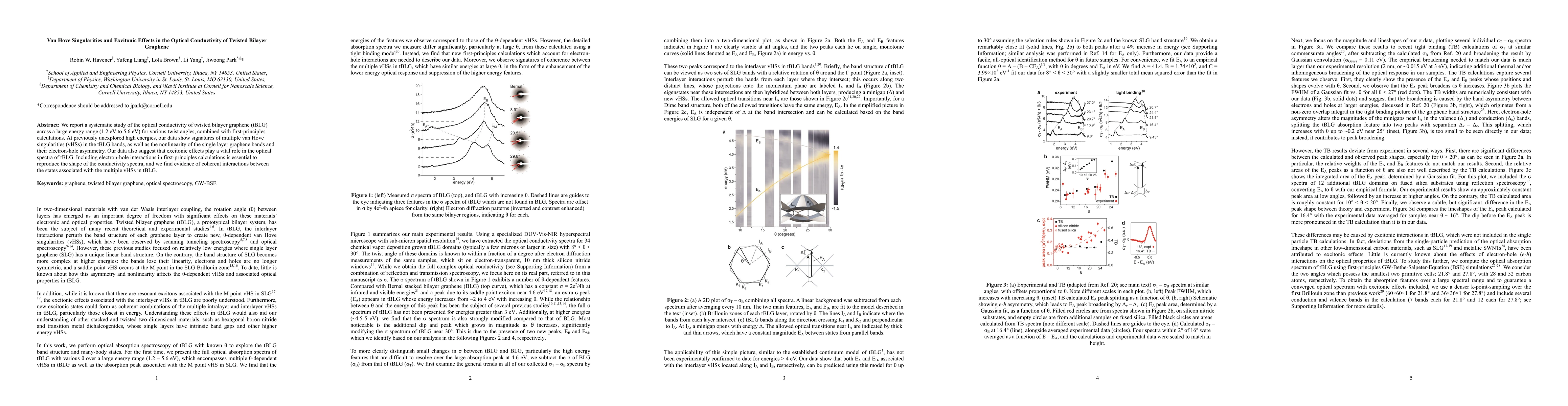 This study investigates the optical conductivity of twisted bilayer graphene across a broad energy range, revealing multiple van Hove singularities and electron-hole asymmetry. Excitonic effects significantly influence the optical spectra, with first-principles calculations showing that including electron-hole interactions is crucial to accurately reproduce the observed conductivity shapes.