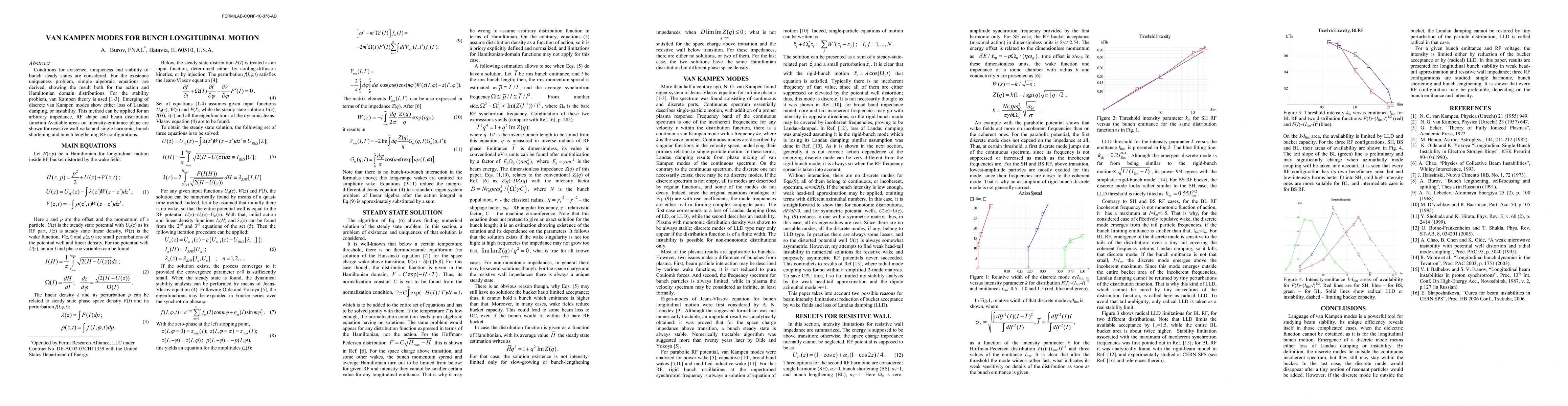 This paper explores the conditions for steady states in bunch longitudinal motion, deriving algebraic equations for existence and uniqueness in both action and Hamiltonian domains. It employs van Kampen theory to analyze stability, identifying discrete van Kampen modes that indicate loss of Landau damping or instability, applicable to various impedances and RF configurations.