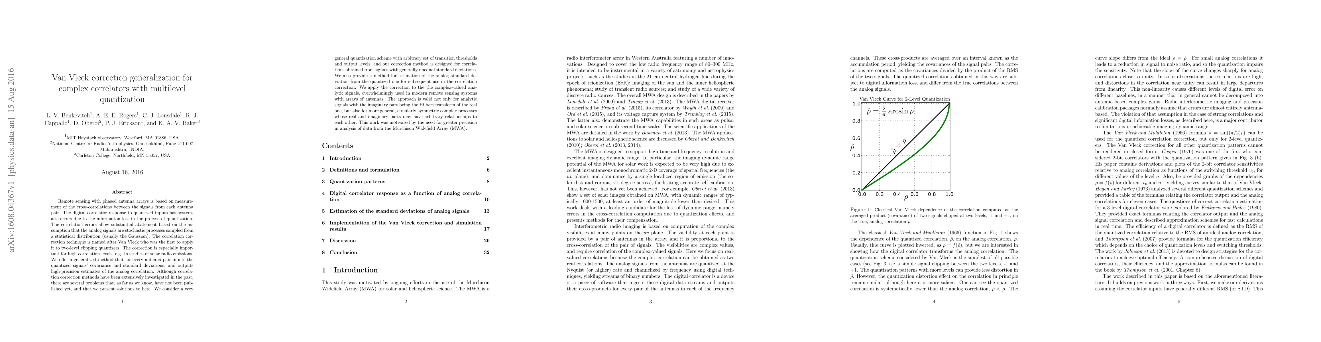 Remote sensing with phased antenna arrays is based on measurement of the cross-correlations between the signals from each antenna pair. Digital correlators have systematic errors due to the quantization losses. The correlation errors allow substantial abatement based on the assumption that the analog signals are stochastic processes sampled from a statistical distribution (usually the Gaussian). The correlation correction technique is named after Van Vleck who was the first to apply it to two-level clipping quantizers. The correction is especially important for high correlation levels, e.g. in studies of solar radio emissions. We offer a generalized method that for every antenna pair inputs the quantized signals' covariance and standard deviations, and outputs high-precision estimates of the analog correlation. Although correlation correction methods have been extensively investigated in the past, there are several problems that, as far as we know, have not been published yet. We consider a very general quantization scheme with arbitrary set of transition thresholds and output levels, and our correction method is designed for correlations obtained from signals with generally unequal standard deviations. We also provide a method for estimation of the analog standard deviation from the quantized one for subsequent use in the correlation correction. We apply the correction to the the complex-valued analytic signals, overwhelmingly used in modern remote sensing systems with arrays of antennas. The approach is valid not only for analytic signals with the imaginary part being the Hilbert transform of the real one, but also for more general, circularly symmetric complex processes whose real and imaginary parts may have arbitrary relationships to each other. This work was motivated by the need for greater precision in analysis of data from the Murchison Widefield Array (MWA).