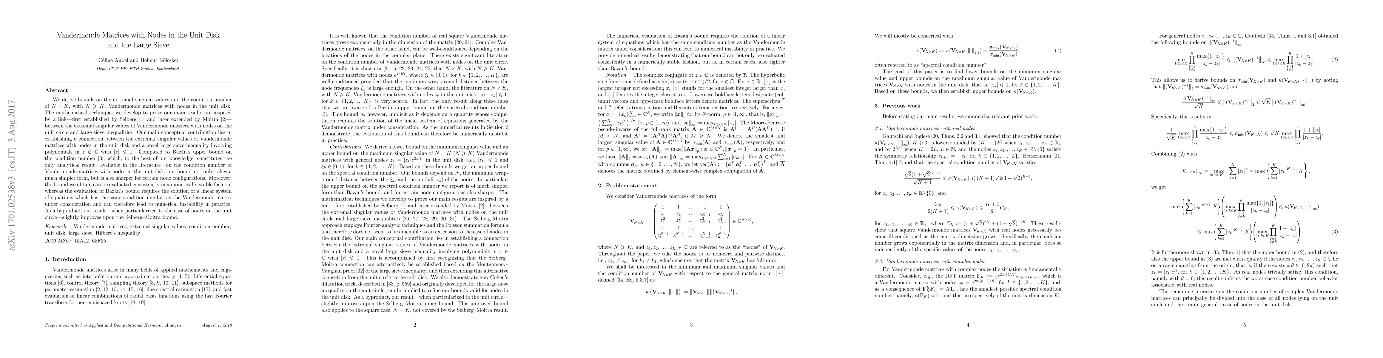 This paper derives improved bounds on the extremal singular values and condition number for NxK Vandermonde matrices with nodes in the unit disk, establishing a novel large sieve inequality for polynomials within the unit disk. The new bounds are simpler and more accurate than previous results, offering a numerically stable evaluation method.