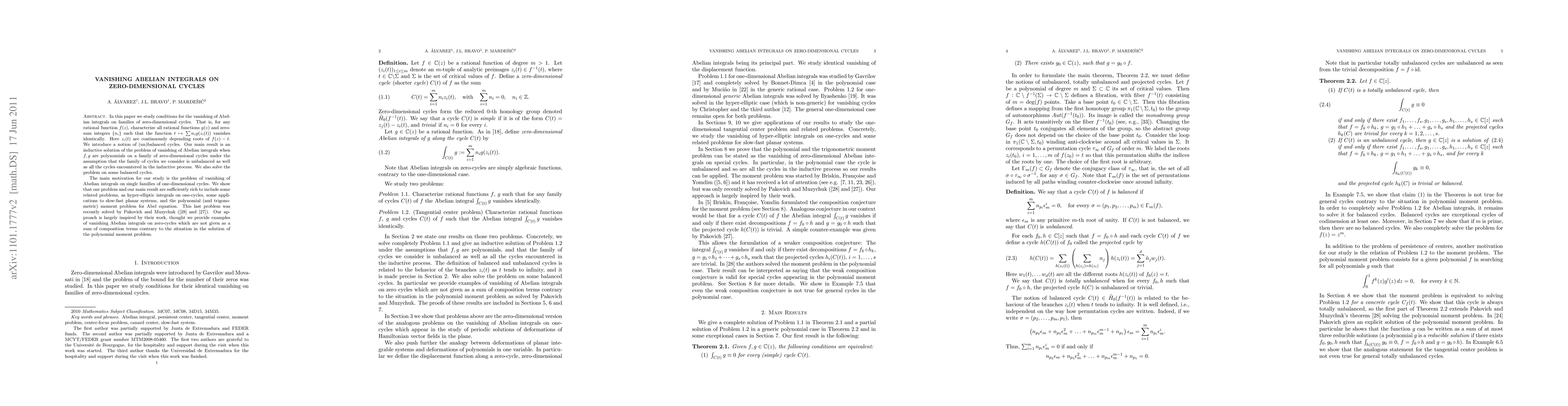 This paper investigates conditions under which Abelian integrals vanish on families of zero-dimensional cycles, characterized by the roots of a rational function $f(z)-t$. The authors introduce the concept of balanced and unbalanced cycles and provide an inductive solution for the vanishing of Abelian integrals when cycles are unbalanced. The study extends to applications in hyper-elliptic integrals, planar systems, and the polynomial moment problem for the Abel equation.