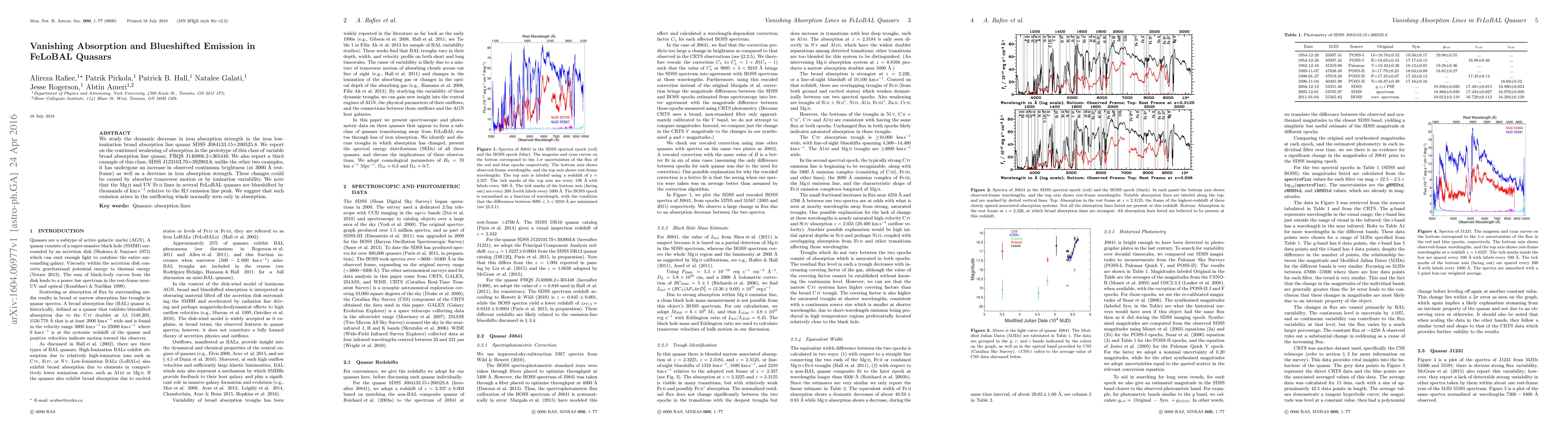 We study the dramatic decrease in iron absorption strength in the iron low-ionization broad absorption line quasar SDSS J084133.15+200525.8. We report on the continued weakening of absorption in the prototype of this class of variable broad absorption line quasar, FBQS J140806.2+305448. We also report a third example of this class, SDSS J123103.70+392903.6; unlike the other two examples, it has undergone an increase in observed continuum brightness (at 3000~\AA\ rest-frame) as well as a decrease in iron absorption strength. These changes could be caused by absorber transverse motion or by ionization variability. We note that the \mgii\ and UV \feii\ lines in several FeLoBAL quasars are blueshifted by thousands of \kms\ relative to the \Hb\ emission line peak. We suggest that such emission arises in the outflowing winds normally seen only in absorption.