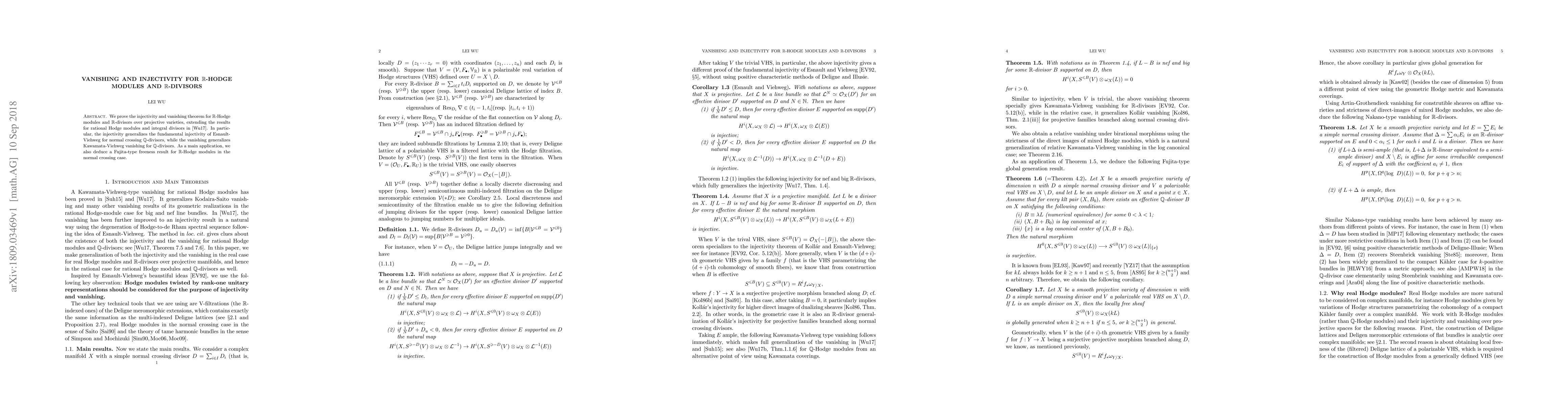 This paper extends the injectivity and vanishing theorems for rational Hodge modules and integral divisors to R-Hodge modules and R-divisors over projective varieties, generalizing results from \cite{Wu15} and deriving a Fujita-type freeness result for R-Hodge modules in the normal crossing case.