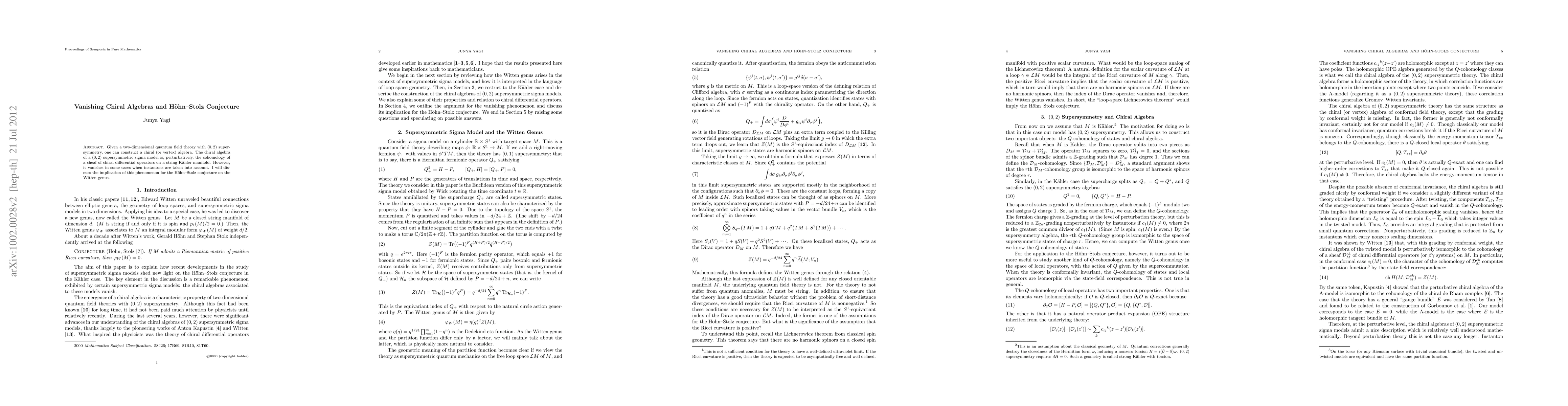 Given a two-dimensional quantum field theory with (0,2) supersymmetry, one can construct a chiral (or vertex) algebra. The chiral algebra of a (0,2) supersymmetric sigma model is, perturbatively, the cohomology of a sheaf of chiral differential operators on a string K\"ahler manifold. However, it vanishes in some cases when instantons are taken into account. I will discuss the implication of this phenomenon for the H\"ohn-Stolz conjecture on the Witten genus.