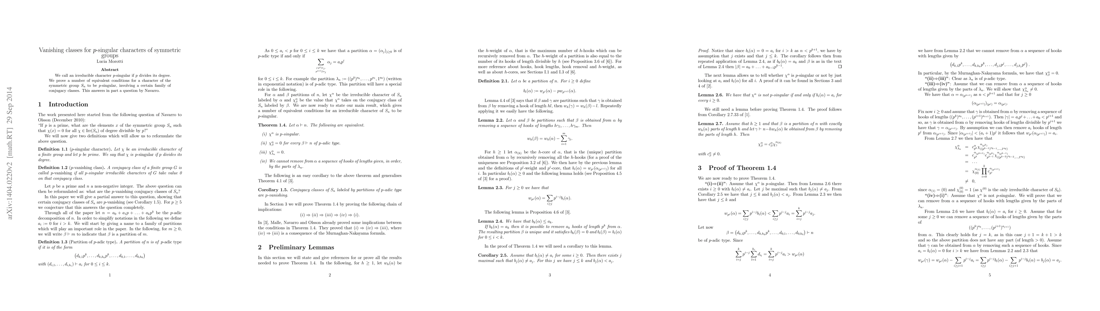 Summary: This paper establishes various equivalent conditions for an irreducible character of the symmetric group $S_n$ to be $p$-singular, demonstrating its relationship with specific conjugacy classes and addressing a question posed by Navarro. The findings enhance understanding of vanishing classes in group characters.