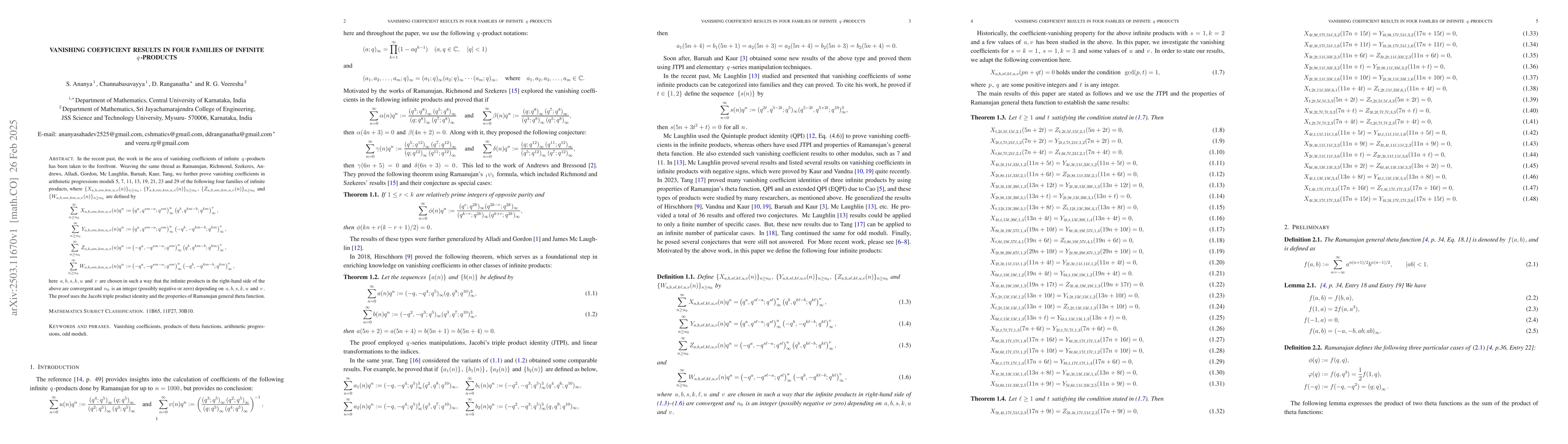 The research proves vanishing coefficients in arithmetic progressions moduli 5, 7, 11, 13, 19, 21, 23, and 29 for four families of infinite q-products. It employs the Jacobi triple product identity and properties of Ramanujan general theta function.