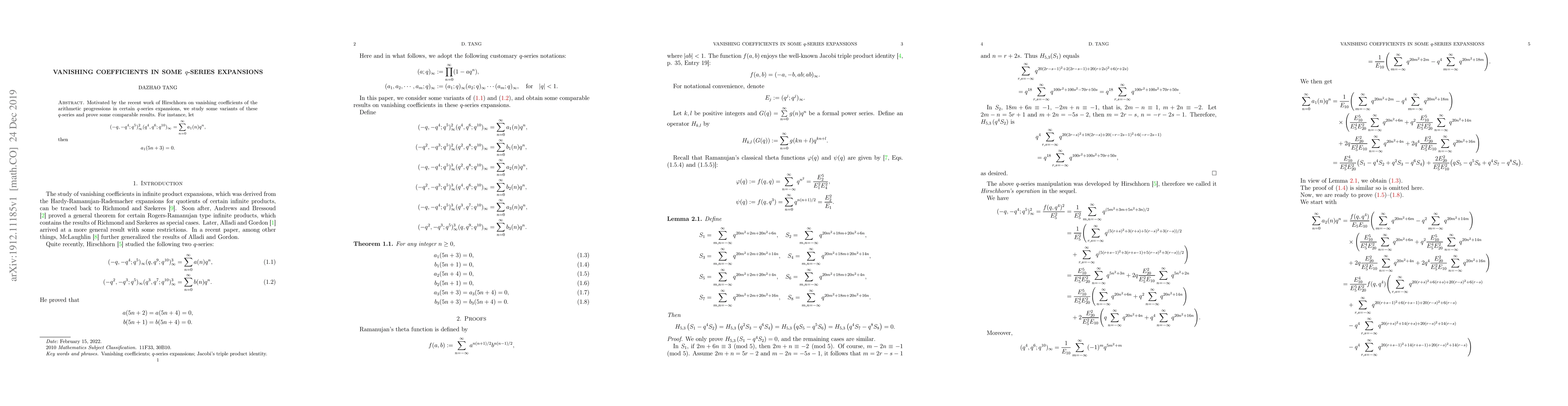 This paper investigates variants of $q$-series expansions, building on Hirschhorn's findings about vanishing coefficients in arithmetic progressions. The study proves that for a specific $q$-series, the coefficient $a_{1}(5n+3)$ vanishes for all $n$.