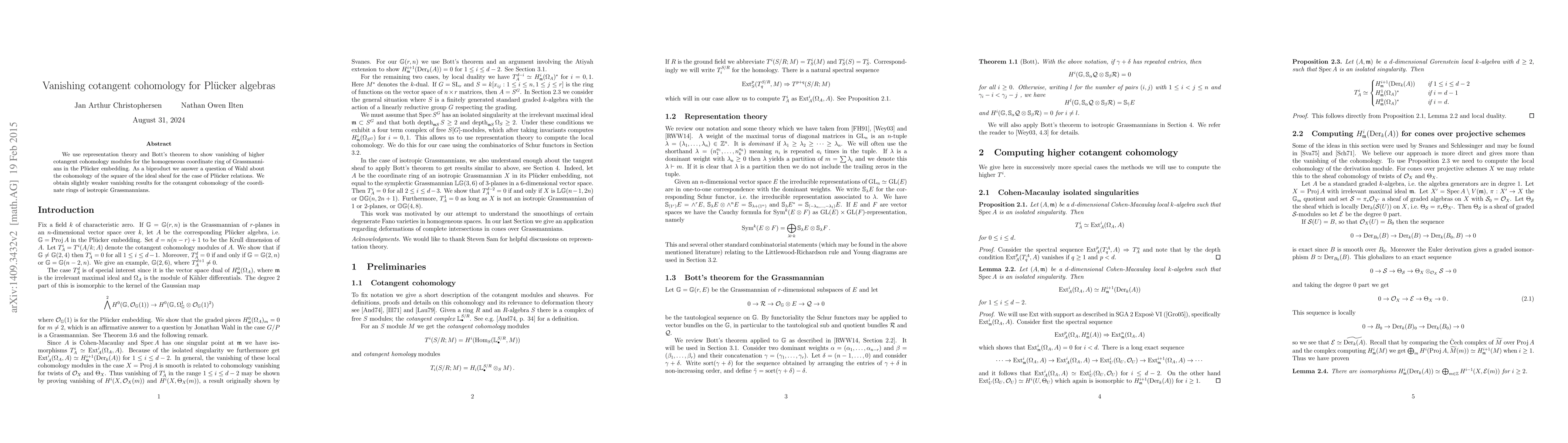 This paper demonstrates the vanishing of higher cotangent cohomology modules for Plückerian coordinate rings of Grassmannians using representation theory and Bott's theorem. Additionally, it resolves Wahl's question about the cohomology of the square of the ideal sheaf within the context of Plückerian relations.