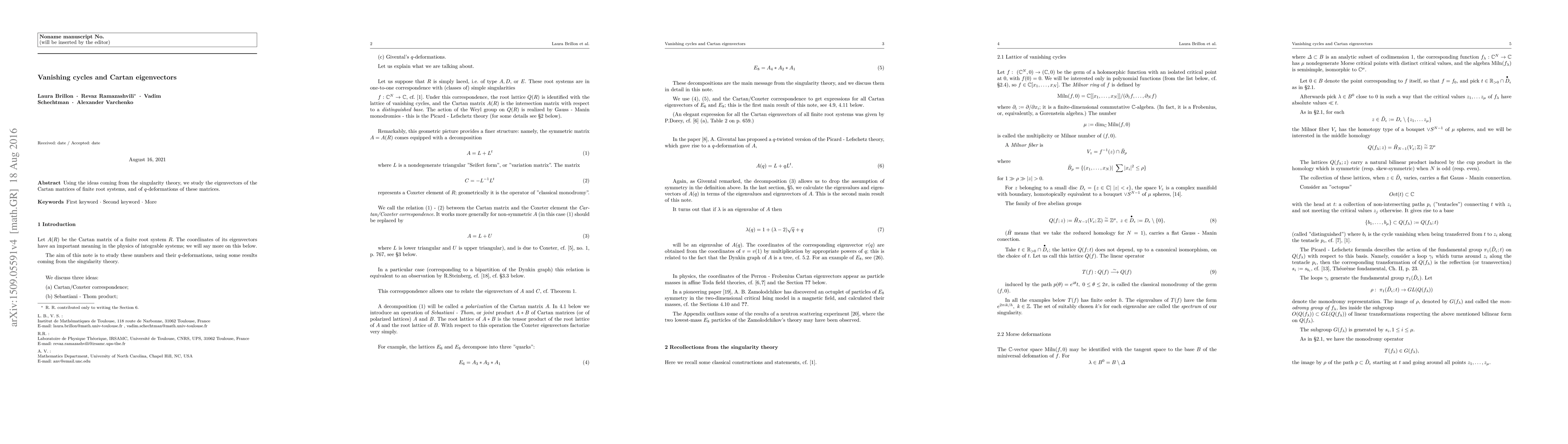 Using the vanishing cycles of simple singularities, we study the eigenvectors of Cartan matrices of finite root systems, and of q-deformations of these matrices.