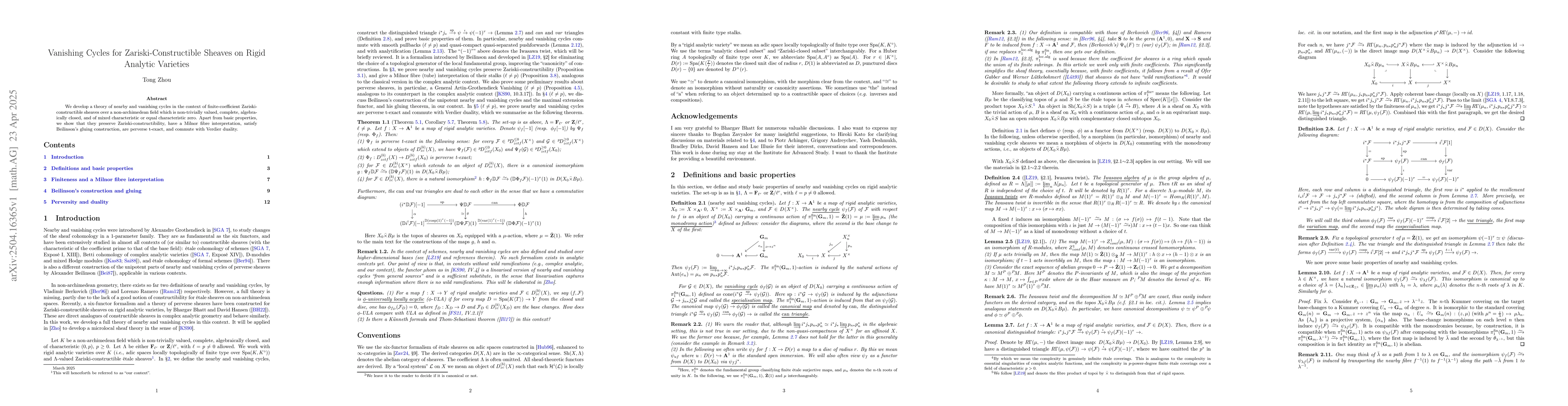 This paper develops a theory of nearby and vanishing cycles for Zariski-constructible sheaves over rigid analytic varieties in non-archimedean fields, proving their preservation of constructibility, Milnor fibre interpretation, and compatibility with Verdier duality and Beilinson's gluing construction.