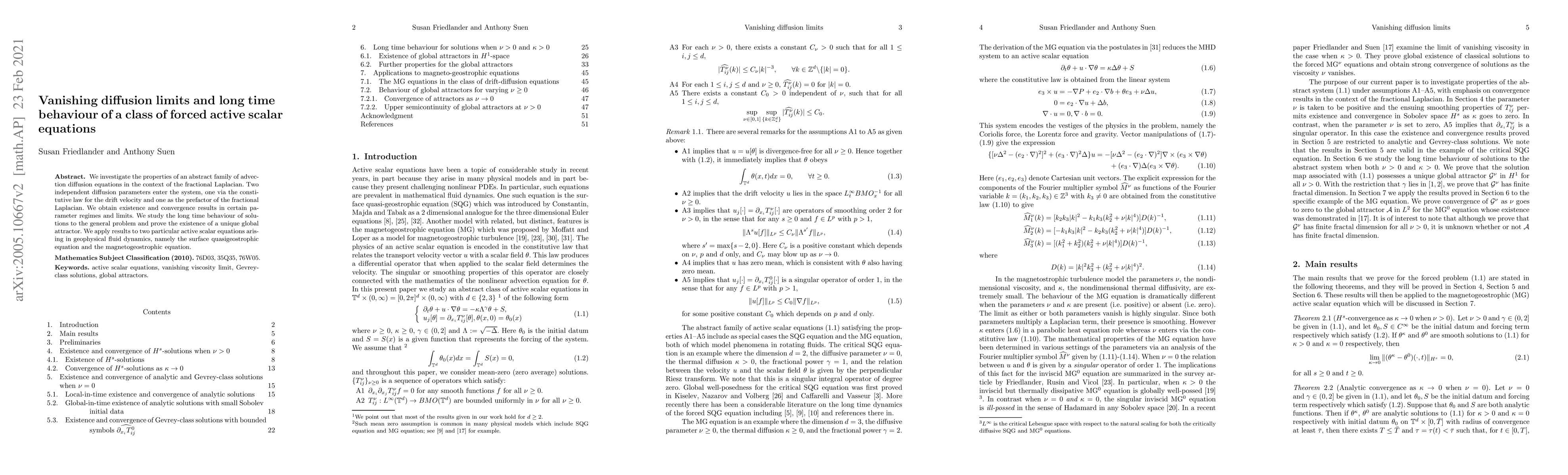 We investigate the properties of an abstract family of advection diffusion equations in the context of the fractional Laplacian. Two independent diffusion parameters enter the system, one via the constitutive law for the drift velocity and one as the prefactor of the fractional Laplacian. We obtain existence and convergence results in certain parameter regimes and limits. We study the long time behaviour of solutions to the general problem and prove the existence of a unique global attractor. We apply results to two particular active scalar equations arising in geophysical fluid dynamics, namely the surface quasigeostrophic equation and the magnetogeostrophic equation.