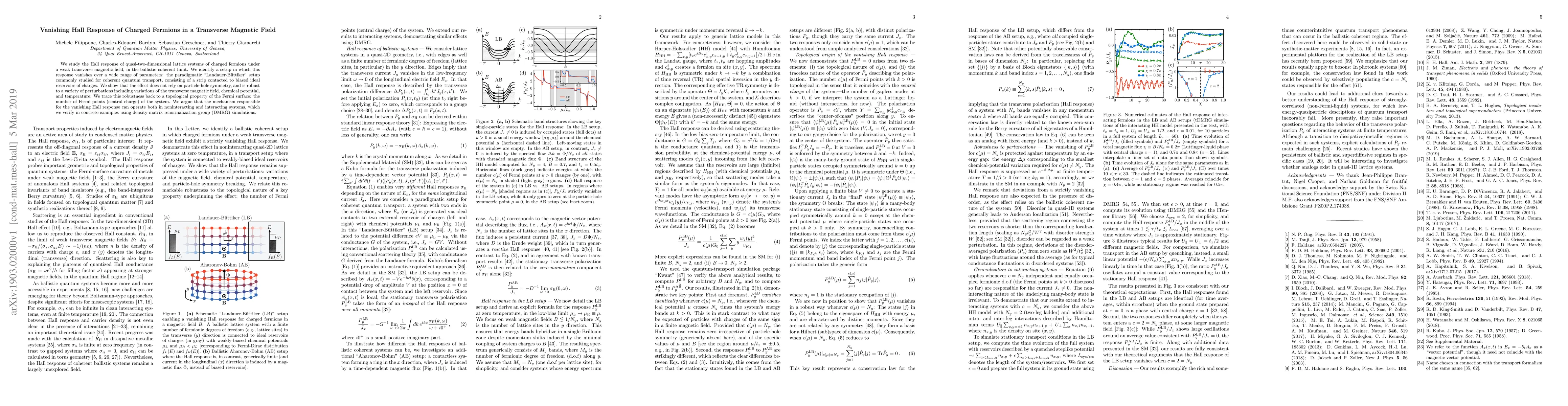 We study the Hall response of quasi-two-dimensional lattice systems of charged fermions under a weak transverse magnetic field, in the ballistic coherent limit. We identify a setup in which this response vanishes over a wide range of parameters: the paradigmatic "Landauer-B\"uttiker" setup commonly studied for coherent quantum transport, consisting of a strip contacted to biased ideal reservoirs of charges. We show that the effect does not rely on particle-hole symmetry, and is robust to a variety of perturbations including variations of the transverse magnetic field, chemical potential, and temperature. We trace this robustness back to a topological property of the Fermi surface: the number of Fermi points (central charge) of the system. We argue that the mechanism responsible for the vanishing Hall response can operate both in noninteracting and interacting systems, which we verify in concrete examples using density-matrix renormalization group (DMRG) simulations.