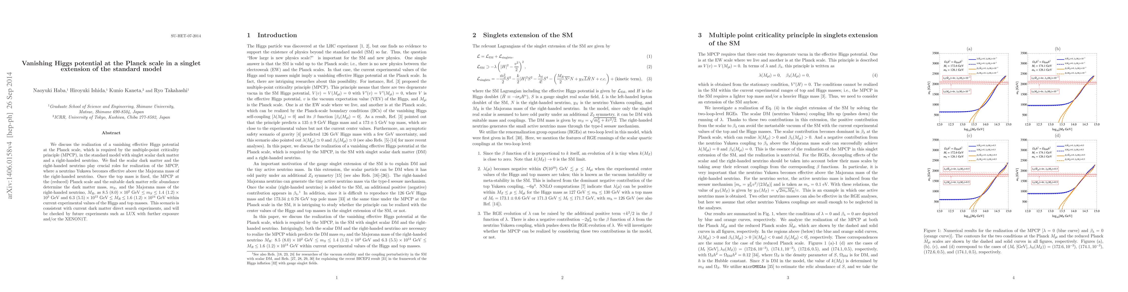 This paper explores a singlet extension of the Standard Model where the effective Higgs potential vanishes at the Planck scale, fulfilling the multiple-point criticality principle (MPCP). The study finds that singlet scalar dark matter and right-handed neutrinos play essential roles in achieving this, with the MPCP determining the masses of these particles within specific ranges consistent with current experimental data and future detection prospects.
