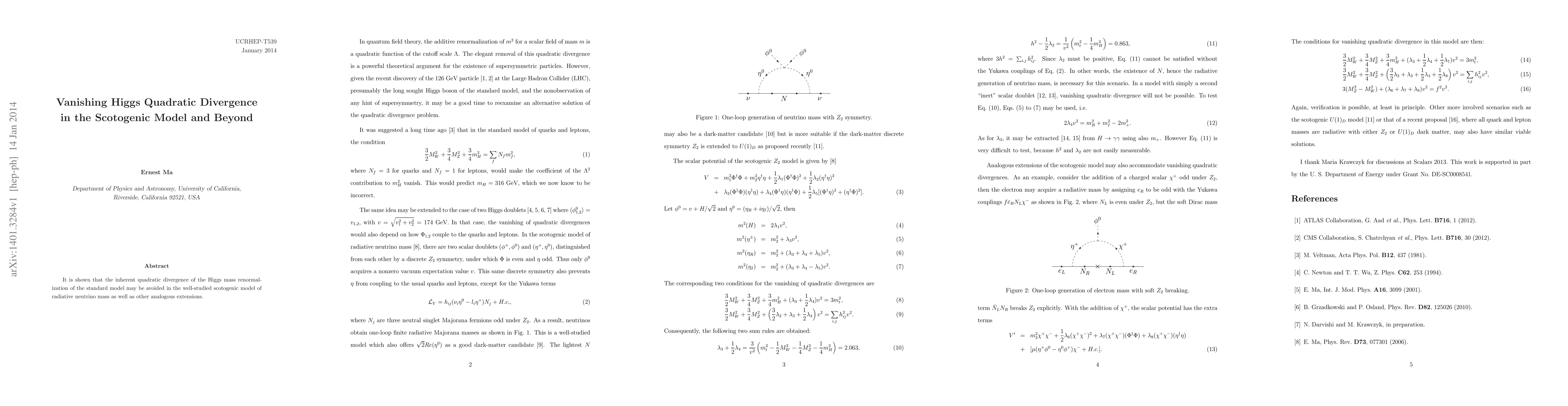 Summary: The scotogenic model and similar extensions can mitigate the quadratic divergence in the Higgs mass renormalization typical of the standard model, offering a potential solution to the mass hierarchy problem. This approach leverages radiative neutrino mass generation mechanisms.