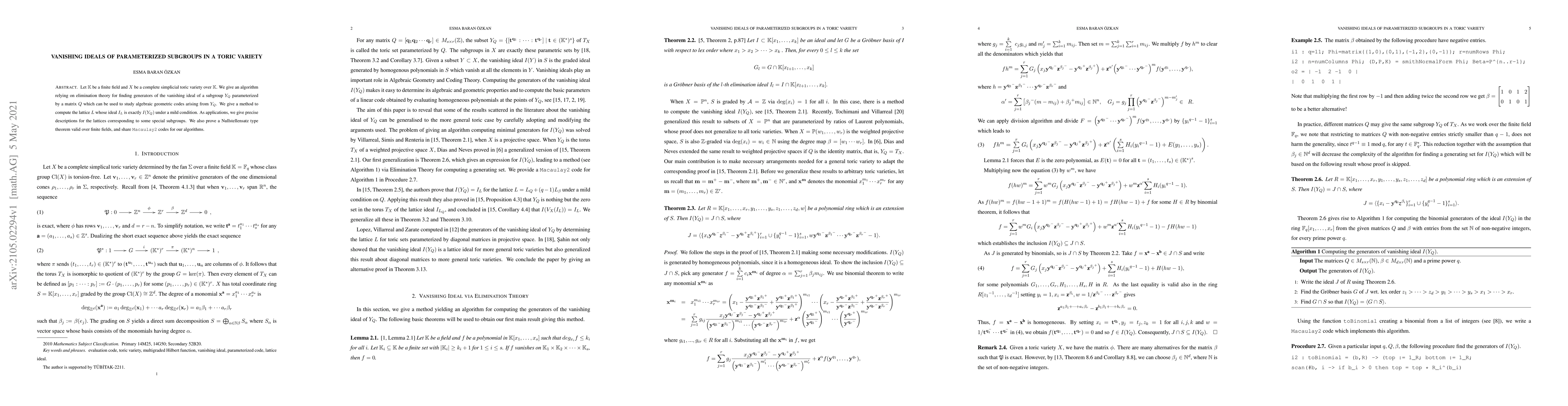 Let $\K$ be a finite field and $X$ be a complete simplicial toric variety over $\K$. We give an algorithm relying on elimination theory for finding generators of the vanishing ideal of a subgroup $Y_Q$ parameterized by a matrix $Q$ which can be used to study algebraic geometric codes arising from $Y_Q$. We give a method to compute the lattice $L$ whose ideal $I_L$ is exactly $I(Y_Q)$ under a mild condition. As applications, we give precise descriptions for the lattices corresponding to some special subgroups. We also prove a Nullstellensatz type theorem valid over finite fields, and share \verb|Macaulay2| codes for our algorithms.