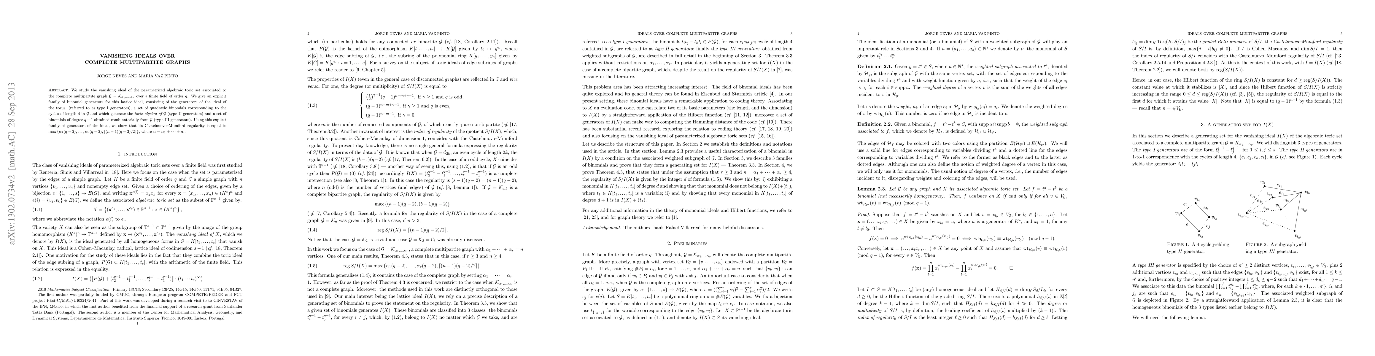 We study the vanishing ideal of the parametrized algebraic toric associated to the complete multipartite graph $\G=\mathcal{K}_{\alpha_1,...,\alpha_r}$ over a finite field of order $q$. We give an explicit family of binomial generators for this lattice ideal, consisting of the generators of the ideal of the torus, (referred to as type I generators), a set of quadratic binomials corresponding to the cycles of length 4 in $\G$ and which generate the \emph{toric algebra of $\G$} (type II generators) and a set of binomials of degree $q-1$ obtained combinatorially from $\G$ (type III generators). Using this explicit family of generators of the ideal, we show that its Castelnuovo--Mumford regularity is equal to $\max\set{\alpha_1(q-2),...,\alpha_r(q-2), \lceil (n-1)(q-2)/2\rceil}$, where $n=\alpha_1+... + \alpha_r$.