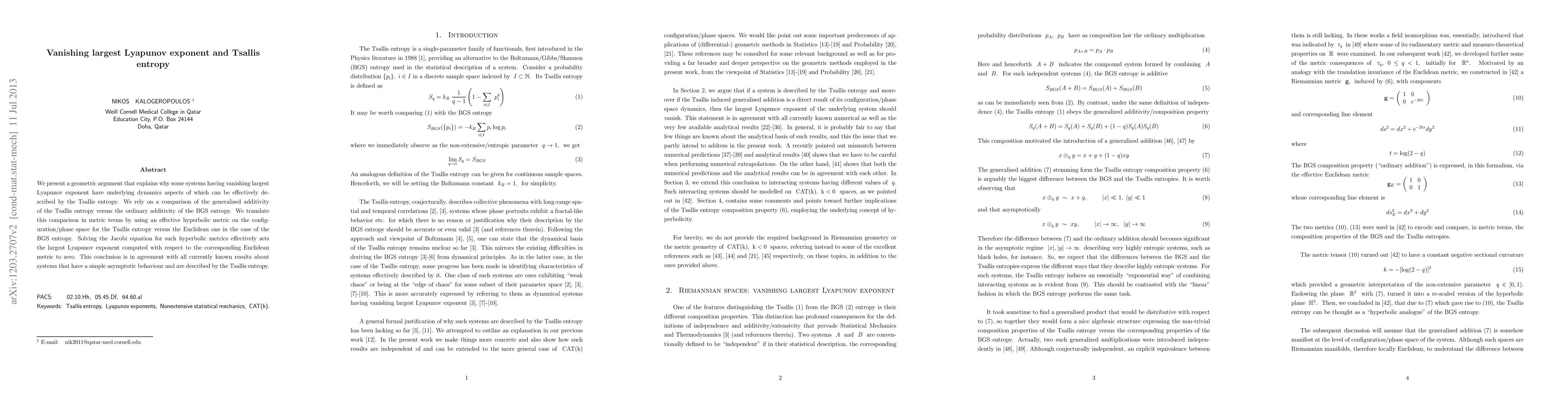 This paper argues that systems with a vanishing largest Lyapunov exponent can be described using Tsallis entropy due to its generalized additivity compared to the ordinary additivity of BGS entropy. The study employs hyperbolic metrics to show how this translates to zero largest Lyapunov exponent, aligning with known results for systems described by Tsallis entropy.