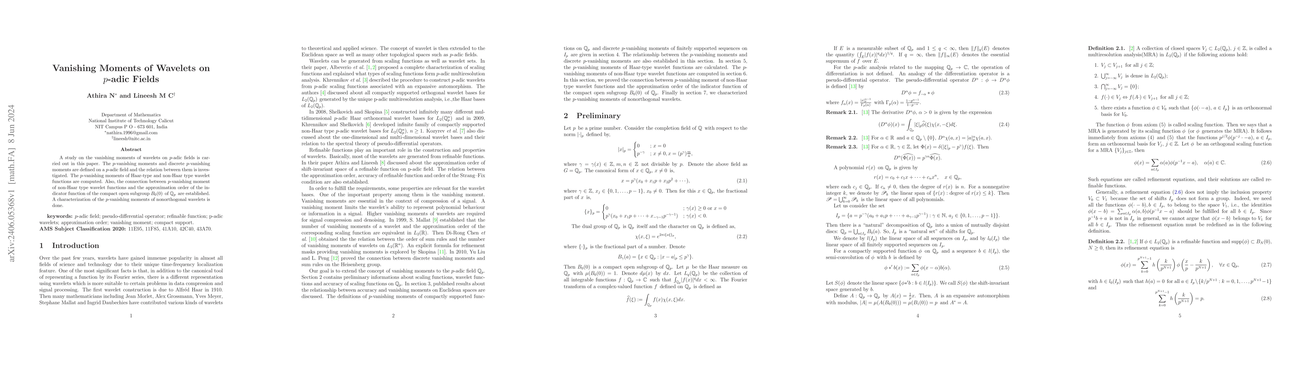 A study on the vanishing moments of wavelets on p-adic fields is carried out in this paper. The p-vanishing moments and discrete p-vanishing moments are defined on a p-adic field and the relation between them is investigated. The p-vanishing moments of Haar-type and non-Haar type wavelet functions are computed. Also, the connection between p-vanishing moment of non-Haar type wavelet functions and the approximation order of the indicator function of the compact open subgroup B0 (0) of Qp are established. A characterization of the p-vanishing moments of nonorthogonal wavelets is done.