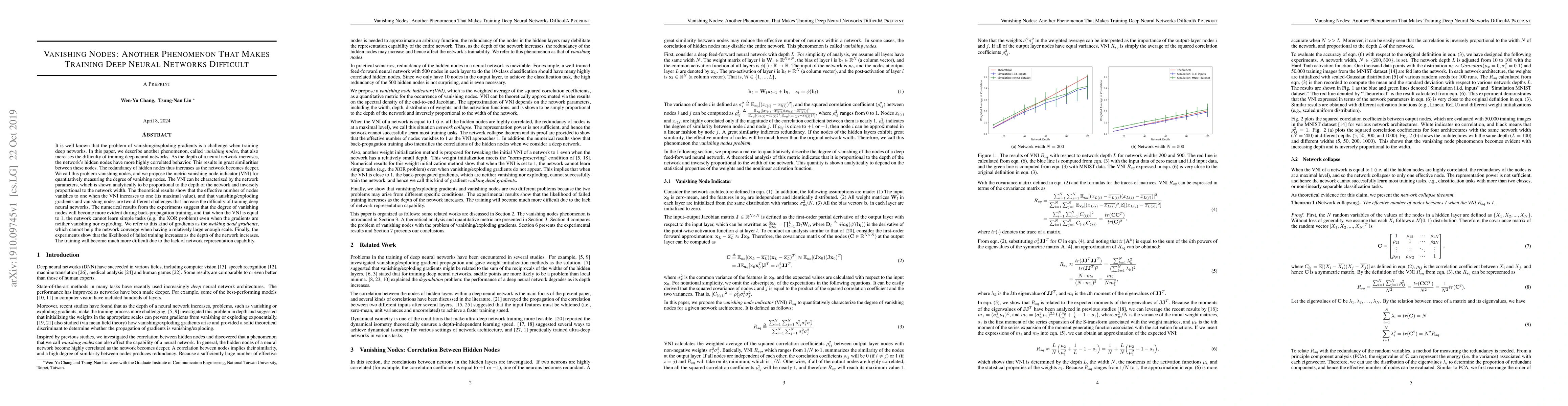 This paper identifies "vanishing nodes" as a new challenge in training deep neural networks, characterized by increased node correlation and redundancy as network depth grows. The proposed vanishing node indicator (VNI) metric quantifies this phenomenon, showing that it exacerbates training difficulties alongside vanishing/exploding gradients, leading to ineffective "walking dead gradients" and higher failure rates in deep networks.