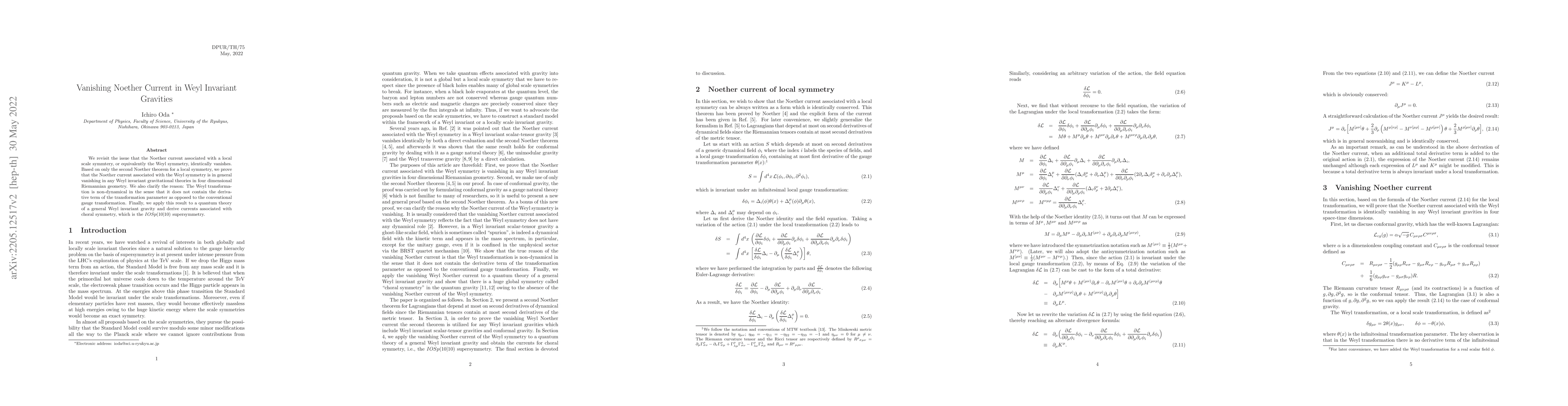 We revisit the issue that the Noether current associated with a local scale symmtery, or equivalently the Weyl symmetry, identically vanishes. Based on only the second Noether theorem for a local symmetry, we prove that the Noether current associated with the Weyl symmetry is in general vanishing in any Weyl invariant gravitational theories in four dimensional Riemannian geometry. We also clarify the reason: The Weyl transformation is non-dynamical in the sense that it does not contain the derivative term of the transformation parameter as opposed to the conventional gauge transformation. Finally, we apply this result to a quantum theory of a general Weyl invariant gravity and derive currents associated with choral symmetry, which is the $IOSp(10|10)$ supersymmetry.