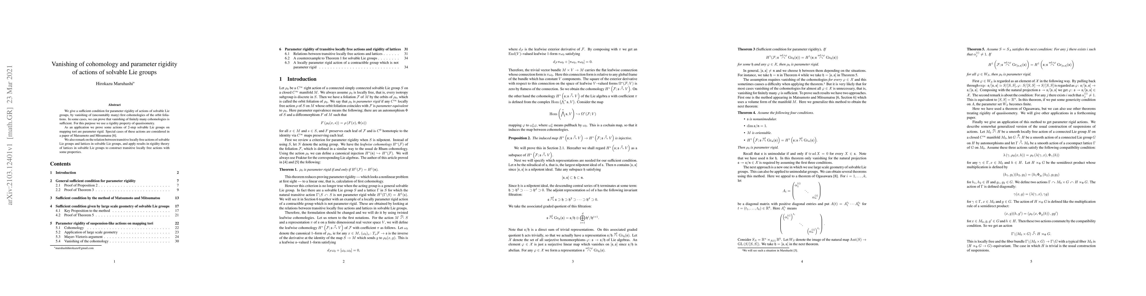 We give a sufficient condition for parameter rigidity of actions of solvable Lie groups, by vanishing of (uncountably many) first cohomologies of the orbit foliations. In some cases, we can prove that vanishing of finitely many cohomologies is sufficient. For this purpose we use a rigidity property of quasiisometry. As an application we prove some actions of 2-step solvable Lie groups on mapping tori are parameter rigid. Special cases of these actions are considered in a paper of Matsumoto and Mitsumatsu. We also remark on the relation between transitive locally free actions of solvable Lie groups and lattices in solvable Lie groups, and apply results in rigidity theory of lattices in solvable Lie groups to construct transitive locally free actions with some properties.