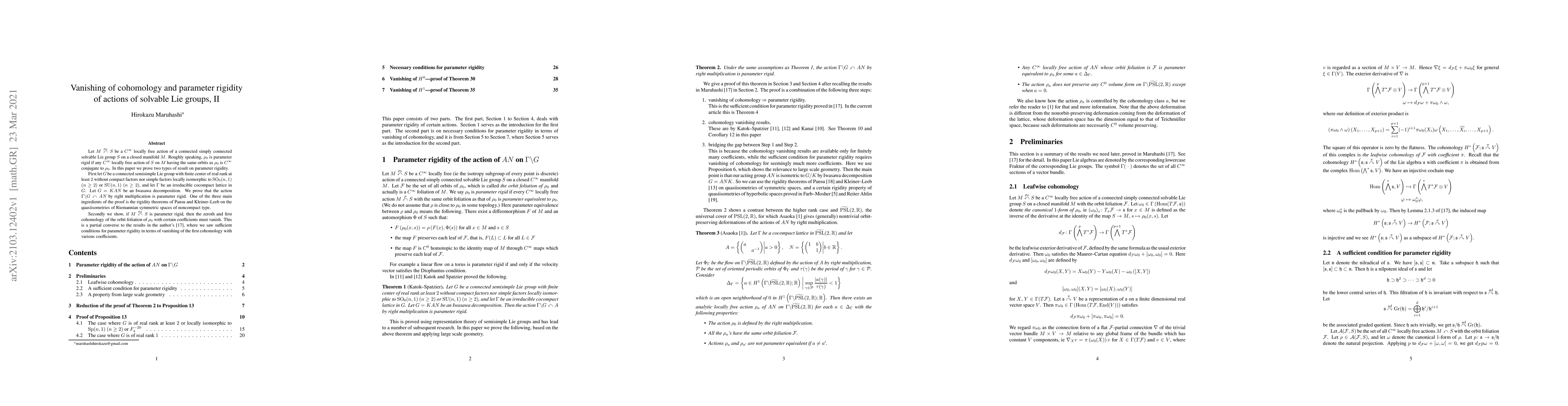 Let $M\stackrel{\rho_0}{\curvearrowleft}S$ be a $C^\infty$ locally free action of a connected simply connected solvable Lie group $S$ on a closed manifold $M$. Roughly speaking, $\rho_0$ is parameter rigid if any $C^\infty$ locally free action of $S$ on $M$ having the same orbits as $\rho_0$ is $C^\infty$ conjugate to $\rho_0$. In this paper we prove two types of result on parameter rigidity. First let $G$ be a connected semisimple Lie group with finite center of real rank at least $2$ without compact factors nor simple factors locally isomorphic to $\mathrm{SO}_0(n,1)$ $(n\geq2)$ or $\mathrm{SU}(n,1)$ $(n\geq2)$, and let $\Gamma$ be an irreducible cocompact lattice in $G$. Let $G=KAN$ be an Iwasawa decomposition. We prove that the action $\Gamma\backslash G\curvearrowleft AN$ by right multiplication is parameter rigid. One of the three main ingredients of the proof is the rigidity theorems of Pansu and Kleiner-Leeb on the quasiisometries of Riemannian symmetric spaces of noncompact type. Secondly we show, if $M\stackrel{\rho_0}{\curvearrowleft}S$ is parameter rigid, then the zeroth and first cohomology of the orbit foliation of $\rho_0$ with certain coefficients must vanish. This is a partial converse to the results in the author's [Vanishing of cohomology and parameter rigidity of actions of solvable Lie groups. Geom. Topol. 21(1) (2017), 157-191], where we saw sufficient conditions for parameter rigidity in terms of vanishing of the first cohomology with various coefficients.