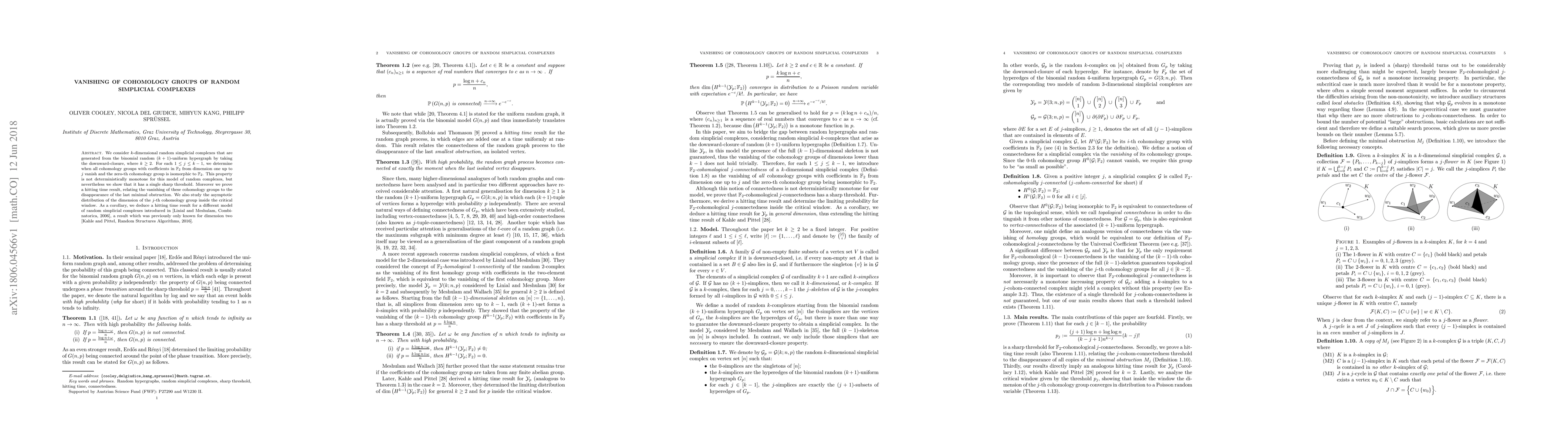 We consider $k$-dimensional random simplicial complexes that are generated from the binomial random $(k+1)$-uniform hypergraph by taking the downward-closure, where $k\geq 2$. For each $1\leq j \leq k-1$, we determine when all cohomology groups with coefficients in $\mathbb{F}_2$ from dimension one up to $j$ vanish and the zero-th cohomology group is isomorphic to $\mathbb{F}_2$. This property is not deterministically monotone for this model of random complexes, but nevertheless we show that it has a single sharp threshold. Moreover we prove a hitting time result, relating the vanishing of these cohomology groups to the disappearance of the last minimal obstruction. We also study the asymptotic distribution of the dimension of the $j$-th cohomology group inside the critical window. As a corollary, we deduce a hitting time result for a different model of random simplicial complexes introduced in [Linial and Meshulam, Combinatorica, 2006], a result which was previously only known for dimension two [Kahle and Pittel, Random Structures Algorithms, 2016].