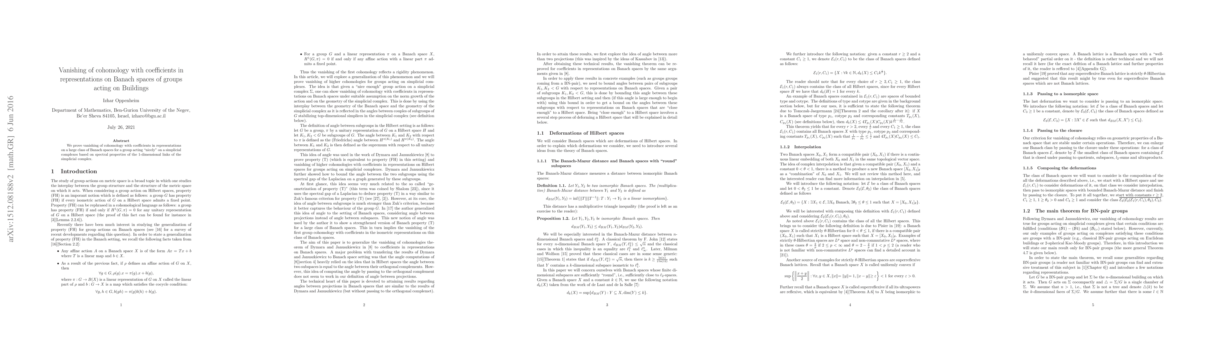 Summary: This paper proves the vanishing of cohomology with coefficients in representations on Banach spaces for groups acting on simplicial complexes, leveraging spectral properties of the 1-dimensional links of the complexes. The results apply to a broad class of Banach spaces.