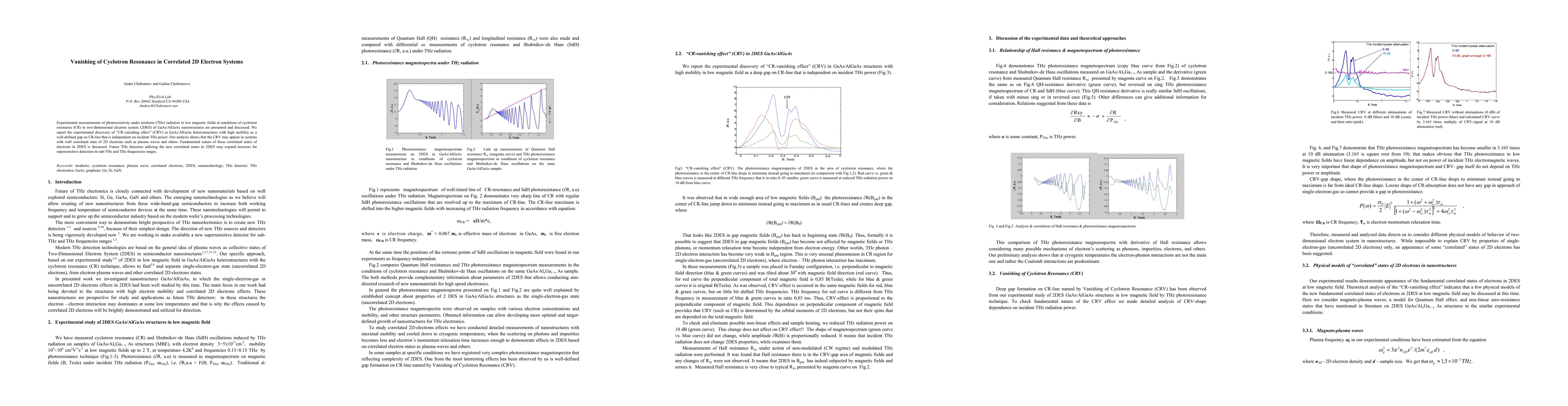 Experimental measurements of photoresistivity under terahertz (THz) radiation in low magnetic fields at conditions of cyclotron resonance (CR) in two-dimensional electron system (2DES) of GaAs/AlGaAs nanostructures are presented and discussed. We report the experimental discovery of CR-vanishing effect (CRV) in GaAs/AlGaAs heterostructures with high mobility as a well-defined gap on CR-line that is independent on incident THz power. Our analysis shows that the CRV may appear in systems with well correlated state of 2D electrons such as plasma waves and others. Fundamental nature of these correlated states of electrons in 2DES is discussed. Future THz detectors utilizing the new correlated states in 2DES may expand horizons for supersensitive and selective detectors in sub-THz and THz frequencies ranges.