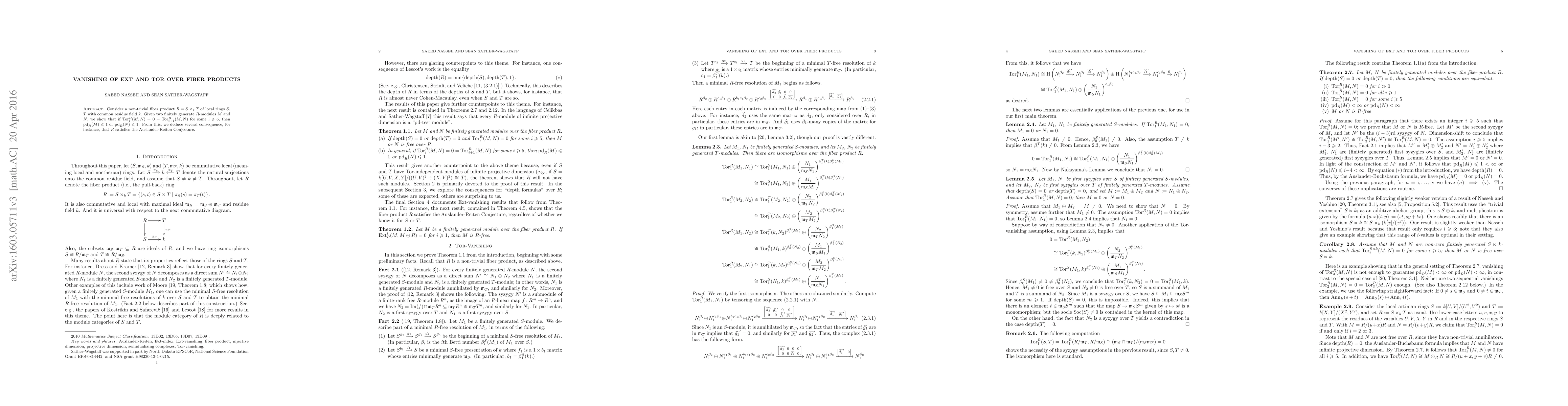 Consider a non-trivial fiber product $R=S\times_kT$ of local rings $S$, $T$ with common residue field $k$. Given two finitely generate $R$-modules $M$ and $N$, we show that if $\operatorname{Tor}^R_i(M,N)=0=\operatorname{Tor}^R_{i+1}(M,N)$ for some $i\geq 5$, then $\operatorname{pd}_R(M)\leq 1$ or $\operatorname{pd}_R(N)\leq 1$. From this, we deduce several consequence, for instance, that $R$ satisfies the Auslander-Reiten Conjecture.