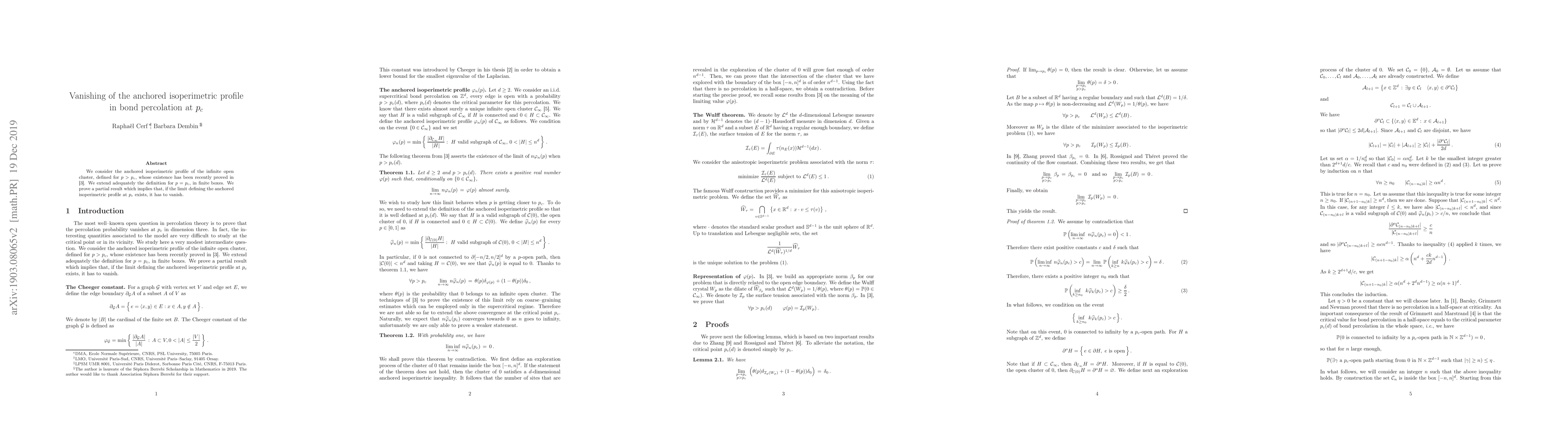 Summary: This paper investigates the anchored isoperimetric profile of the infinite open cluster in bond percolation, proving that the profile vanishes if it exists at the critical percolation threshold $p\_c$. This extends the definition to $p = p\_c$ and provides a partial result indicating the profile's non-existence at this critical point.