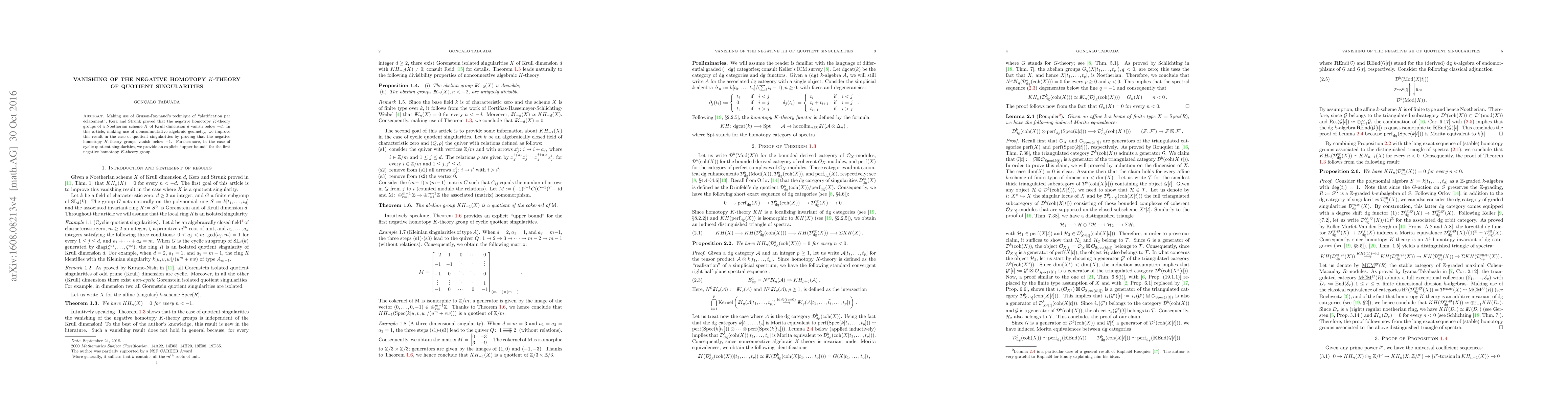 This paper uses noncommutative algebraic geometry to enhance Gruson-Raynaud's technique, showing that the negative homotopy K-theory groups of quotient singularities vanish below -1. For cyclic quotient singularities, it provides an explicit upper bound for the first negative homotopy K-theory group.