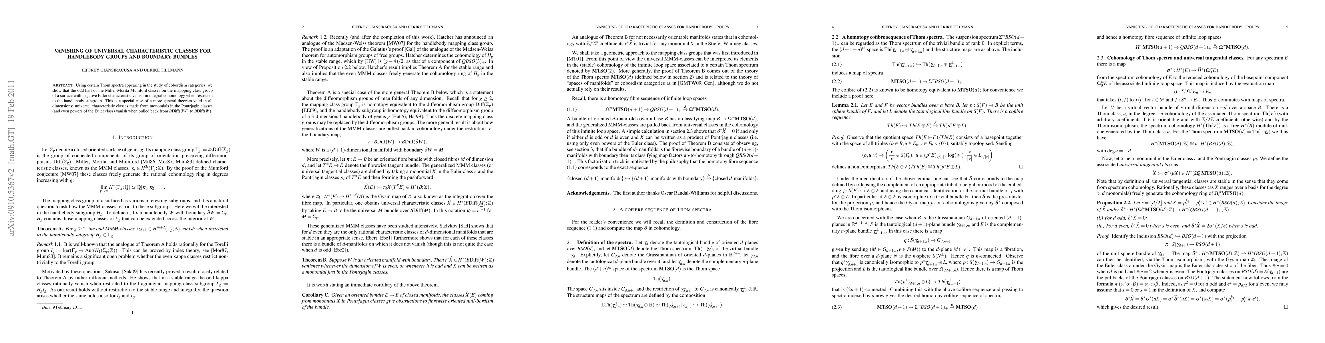 Using certain Thom spectra appearing in the study of cobordism categories, we show that the odd half of the Miller-Morita-Mumford classes on the mappping class group of a surface with negative Euler characteristic vanish in integral cohomology when restricted to the handlebody subgroup. This is a special case of a more general theorem valid in all dimensions: universal characteristic classes made from monomials in the Pontrjagin classes (and even powers of the Euler class) vanish when pulled back from BDiff(\partial W) to BDiff(W).