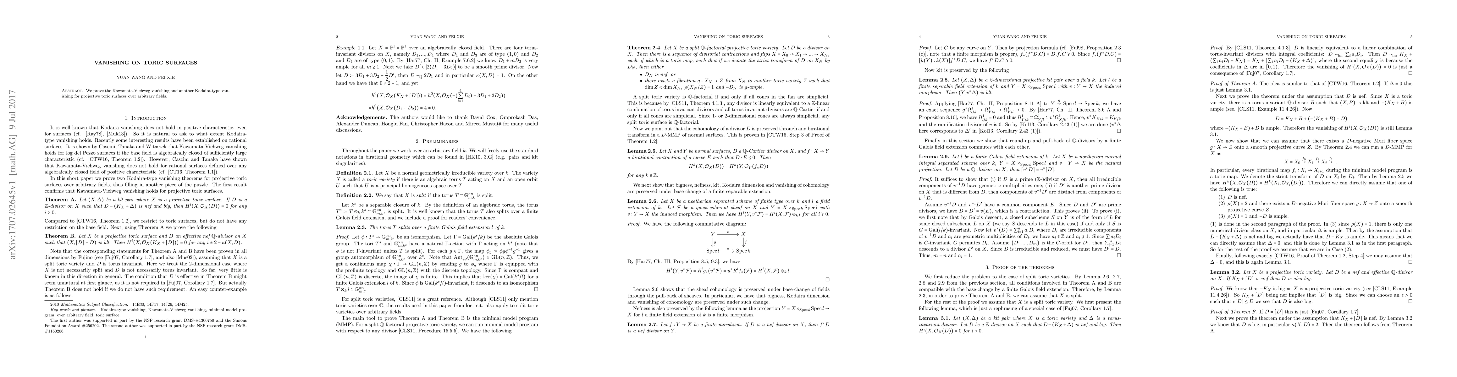 Summary: The paper proves the Kawamata-Viehweg vanishing theorem and a Kodaira-type vanishing theorem for projective toric surfaces over any field, extending results from classical algebraic geometry to a more general setting.