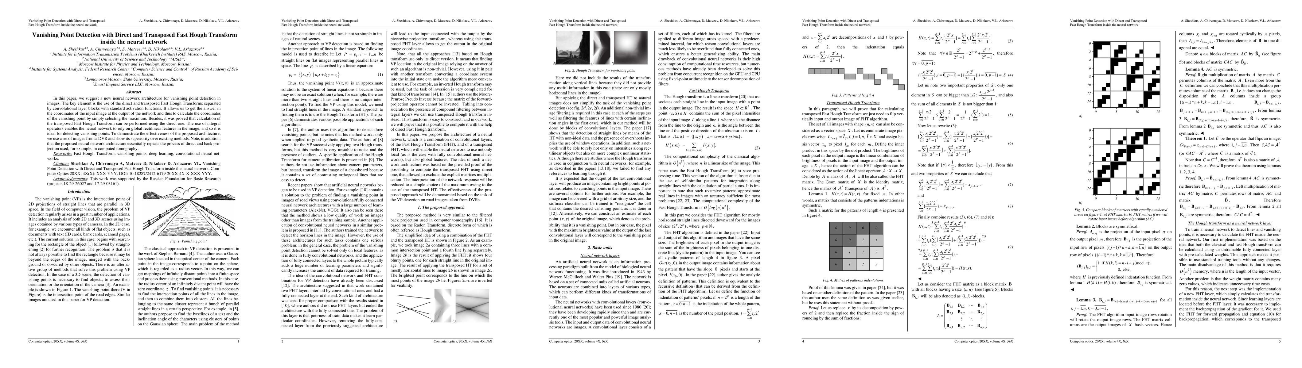 This paper proposes a novel neural network architecture for vanishing point detection using direct and transposed Fast Hough Transforms within convolutional layers. The method outputs vanishing point coordinates directly from the input image, demonstrating superior performance over existing techniques on DVR images.