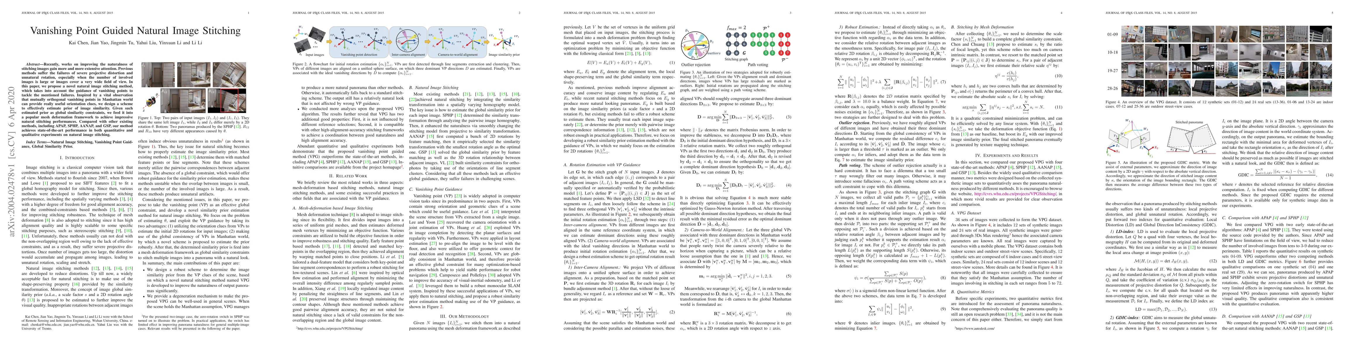 This paper proposes a novel natural image stitching method that leverages vanishing points to address projective distortion and unnatural rotations, especially in large-scale panoramas. By estimating image similarity using orthogonal vanishing points, the method integrates global similarity constraints into a mesh deformation framework to achieve superior stitching results.