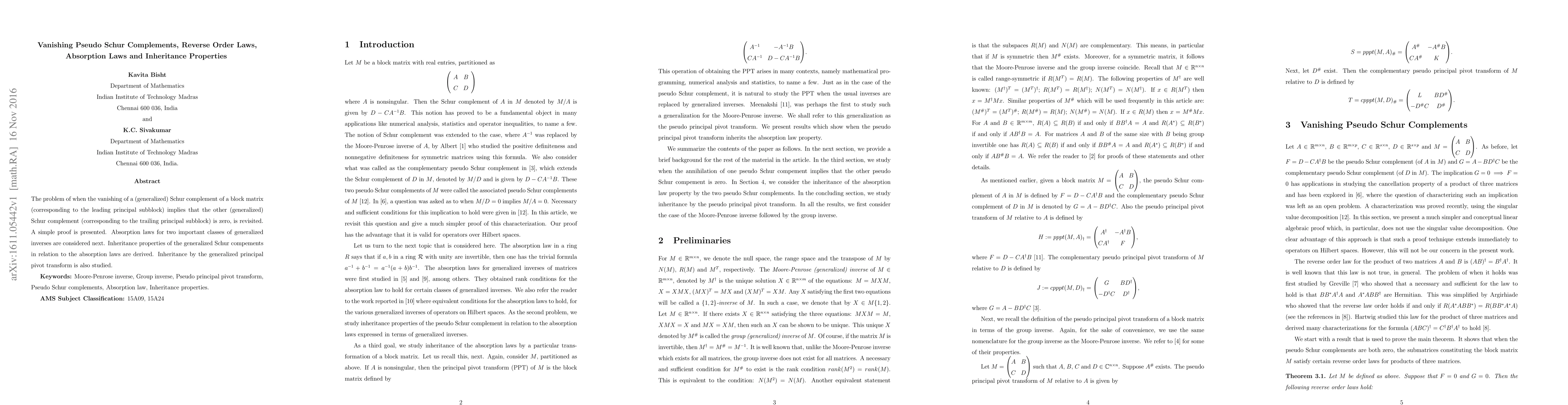 This paper explores the conditions under which the vanishing of a Schur complement implies the zeroness of another, presenting a simple proof. It also examines absorption laws for generalized inverses and investigates inheritance properties related to these laws and the generalized principal pivot transform.