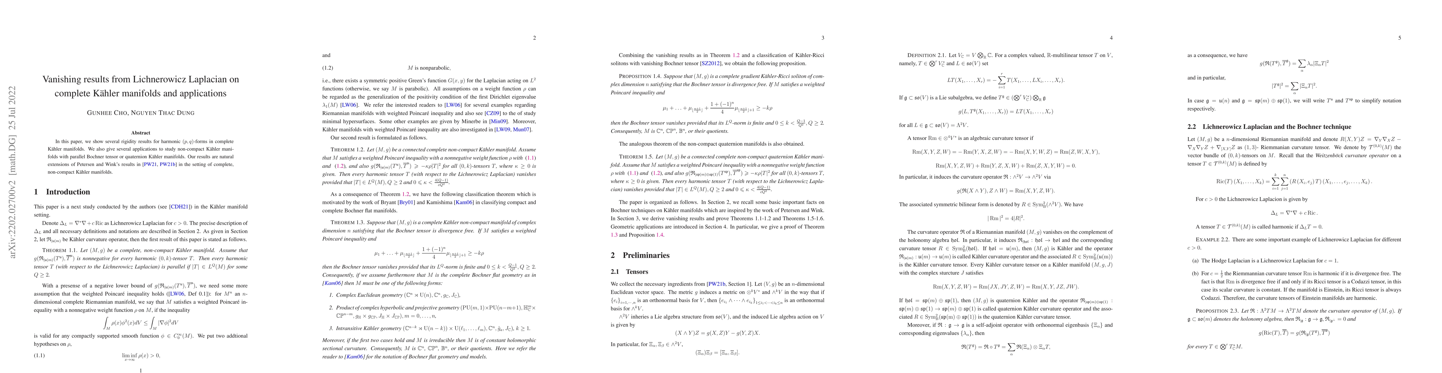 This paper demonstrates rigidity results for harmonic $(p,q)$-forms on complete Kähler manifolds and extends previous findings to non-compact settings. Applications include the study of non-compact Kähler manifolds with parallel Bochner tensor and quaternion Kähler manifolds.