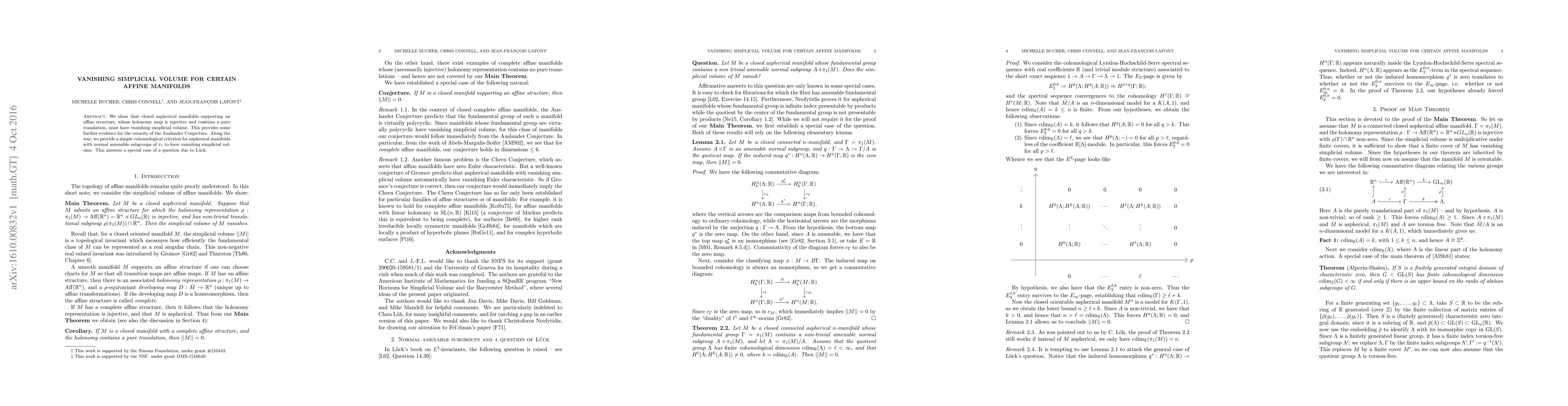 We show that closed aspherical manifolds supporting an affine structure, whose holonomy map is injective and contains a pure translation, must have vanishing simplicial volume. This provides some further evidence for the veracity of the Auslander Conjecture. Along the way, we provide a simple cohomological criterion for aspherical manifolds with normal amenable subgroups of $\pi_1$ to have vanishing simplicial volume. This answers a special case of a question due to L\"uck.