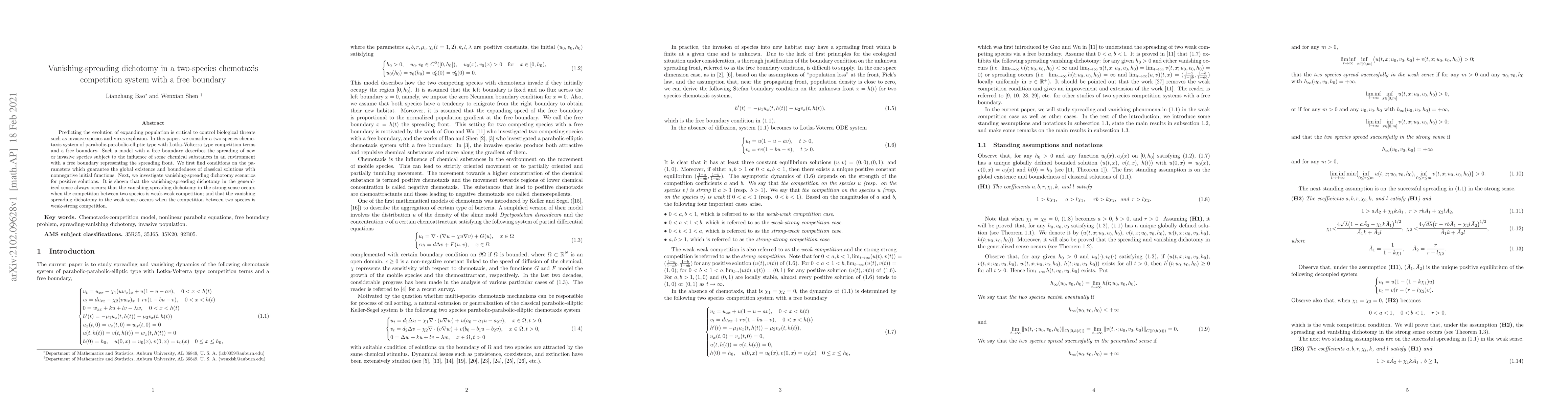 This paper studies a two-species chemotaxis competition model with a free boundary, focusing on the global existence and boundedness of solutions under nonnegative initial conditions. It reveals a vanishing-spreading dichotomy, where the spreading behavior depends on the nature of competition between species: weak-weak or weak-strong.