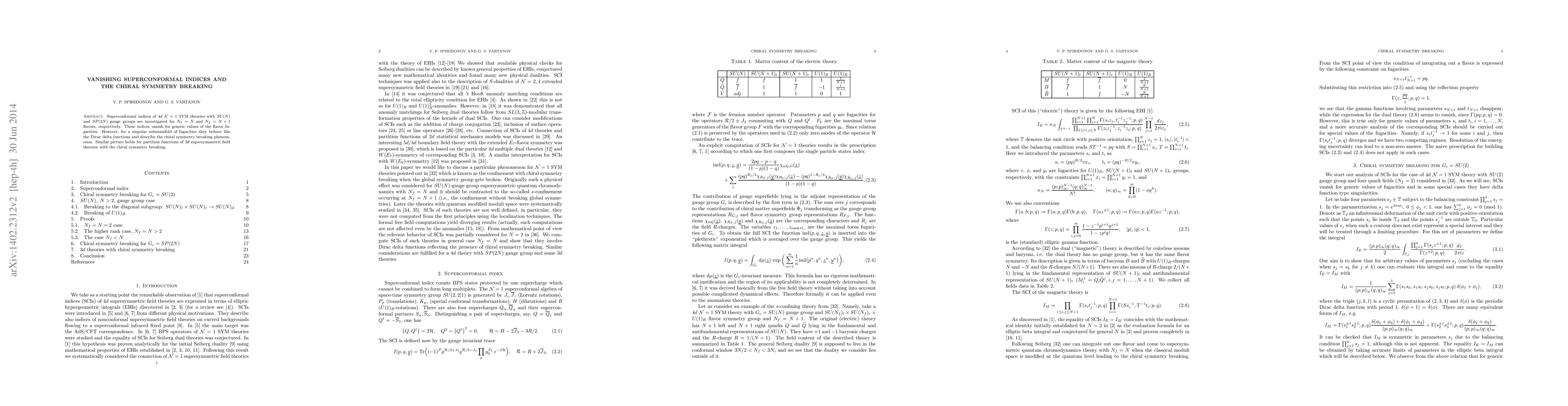 The paper investigates the vanishing superconformal indices in 4d \N=1 SYM theories for specific gauge groups and flavors, revealing that these indices vanish generally but behave like delta functions on a singular submanifold, indicating chiral symmetry breaking. This behavior mirrors findings in 3d supersymmetric field theories with similar symmetry breaking characteristics.