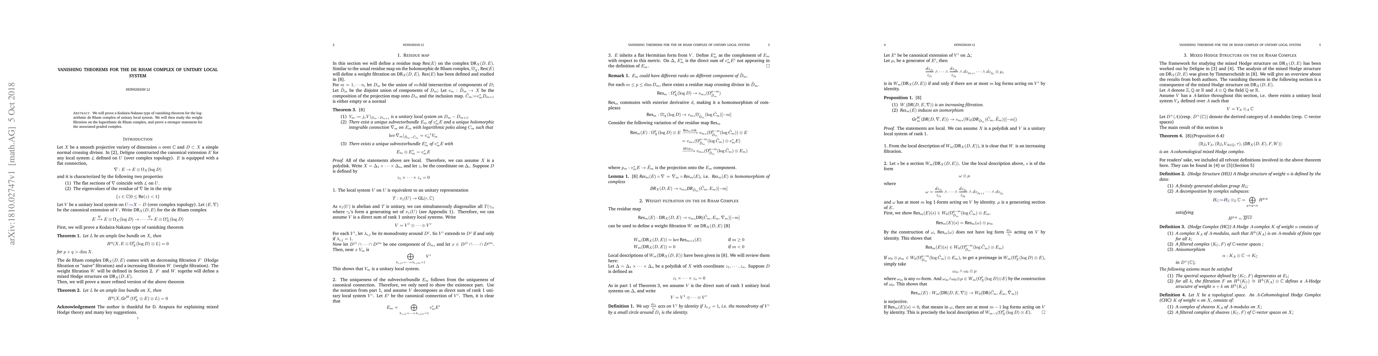 This paper proves a Kodaira-Nakano type vanishing theorem for the logarithmic de Rham complex of unitary local systems and investigates the weight filtration on this complex, establishing a stronger result for the associated graded complex.