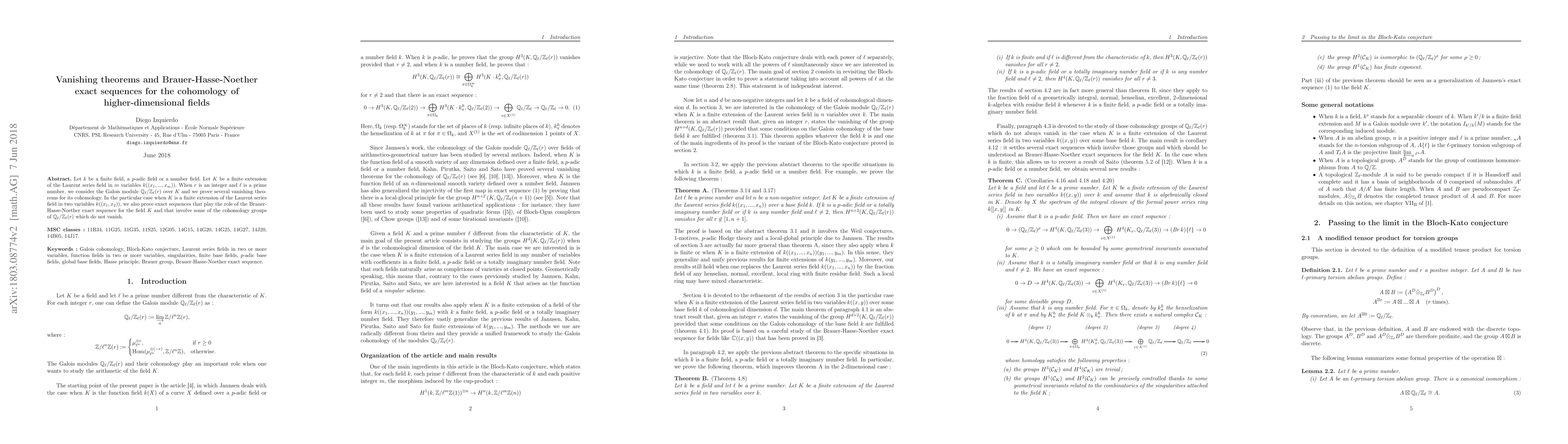 Let $k$ be a finite field, a $p$-adic field or a number field. Let $K$ be a finite extension of the Laurent series field in $m$ variables $k((x_1,...,x_m))$ or, more generally, a finite extension of the field of rational functions $k((x_1,...,x_m))(y_1,...,y_n)$. When $r$ is an integer, we consider the Galois module $\mathbb{Q}/\mathbb{Z}(r)$ over $K$ and we prove several vanishing theorems for its cohomology. In the particular case when $K$ is a finite extension of the Laurent series field in two variables $k((x_1,x_2))$, we also prove exact sequences that play the role of the Brauer-Hasse-Noether exact sequence for the field $K$ and that involve some of the cohomology groups of $\mathbb{Q}/\mathbb{Z}(r)$ which do not vanish.
