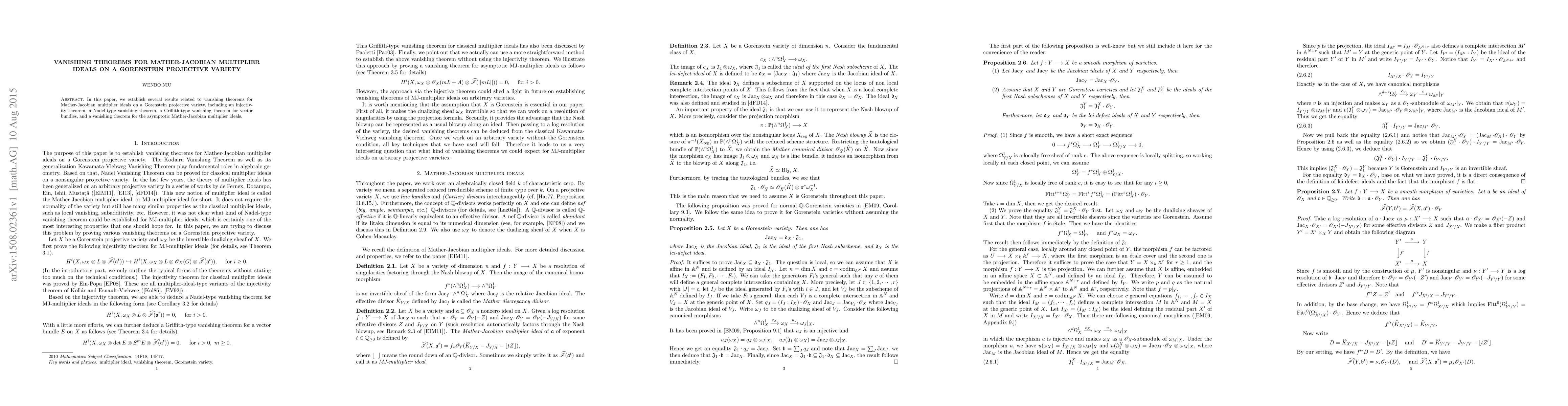 In this paper, we establish several results related to vanishing theorems for Mather-Jacobian multiplier ideals on a Gorenstein projective variety, including an injectivity theorem, a Nadel-type vanishing theorem, a Griffith-type vanishing theorem for vector bundles, and a vanishing theorem for the asymptotic Mather-Jacobian multiplier ideals.