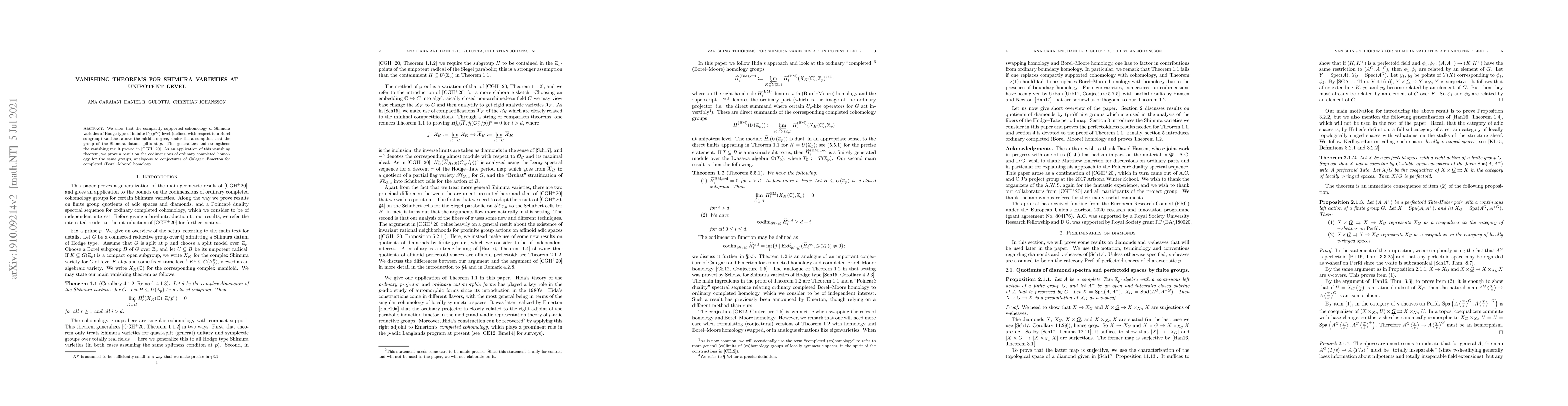 This paper demonstrates the vanishing of compactly supported cohomology for certain Shimura varieties at unipotent level, provided the group splits at a prime $p$. It generalizes previous results and applies this to derive codimension results for ordinary completed homology, aligning with conjectures by Calegari-Emerton.