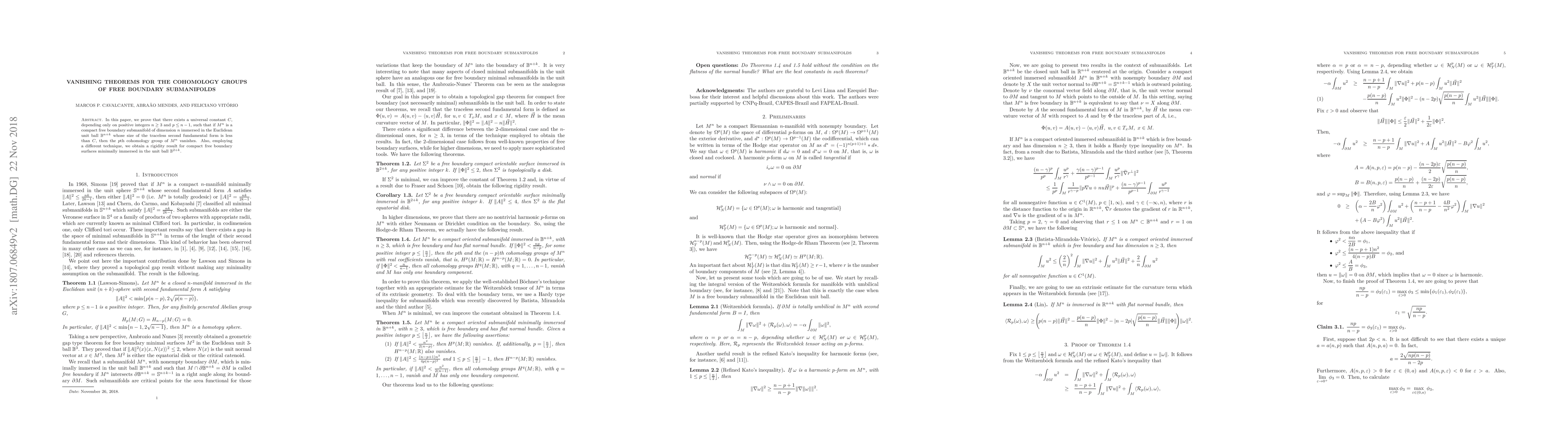 This research paper presents vanishing theorems for the cohomology groups of free boundary hypersurfaces, establishing a universal constant C dependent on dimensions n≥3 and p≤n-1. The results indicate that compact free boundary submanifolds of the Euclidean unit ball with traceless second fundamental form size less than C have vanishing pth cohomology groups. Additionally, a rigidity result is obtained for compact free boundary surfaces minimally immersed in the unit ball.